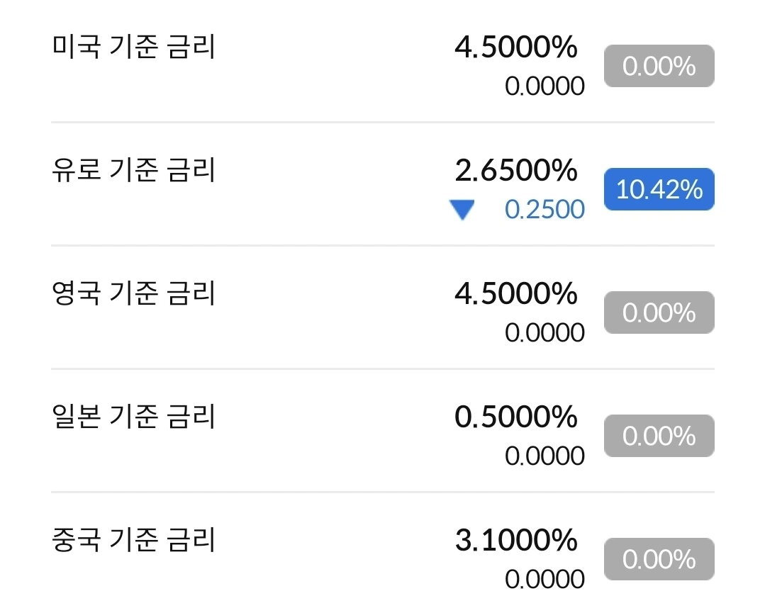 금리 변동이 증시 변동을 이끌기 때문에 수시로 확인할 필요가 있다. 한국금리와 미국 금리차는 1.75%이다. 결코 작지 않은 차이를 기록 중이다. 유럽연합은 경기 부양을 위해서 지속적인 금리인하를 단행 중이다. 한국보다 금리가 더 낮아졌다. 유럽이 지금 참으로 어려운 듯 하다.