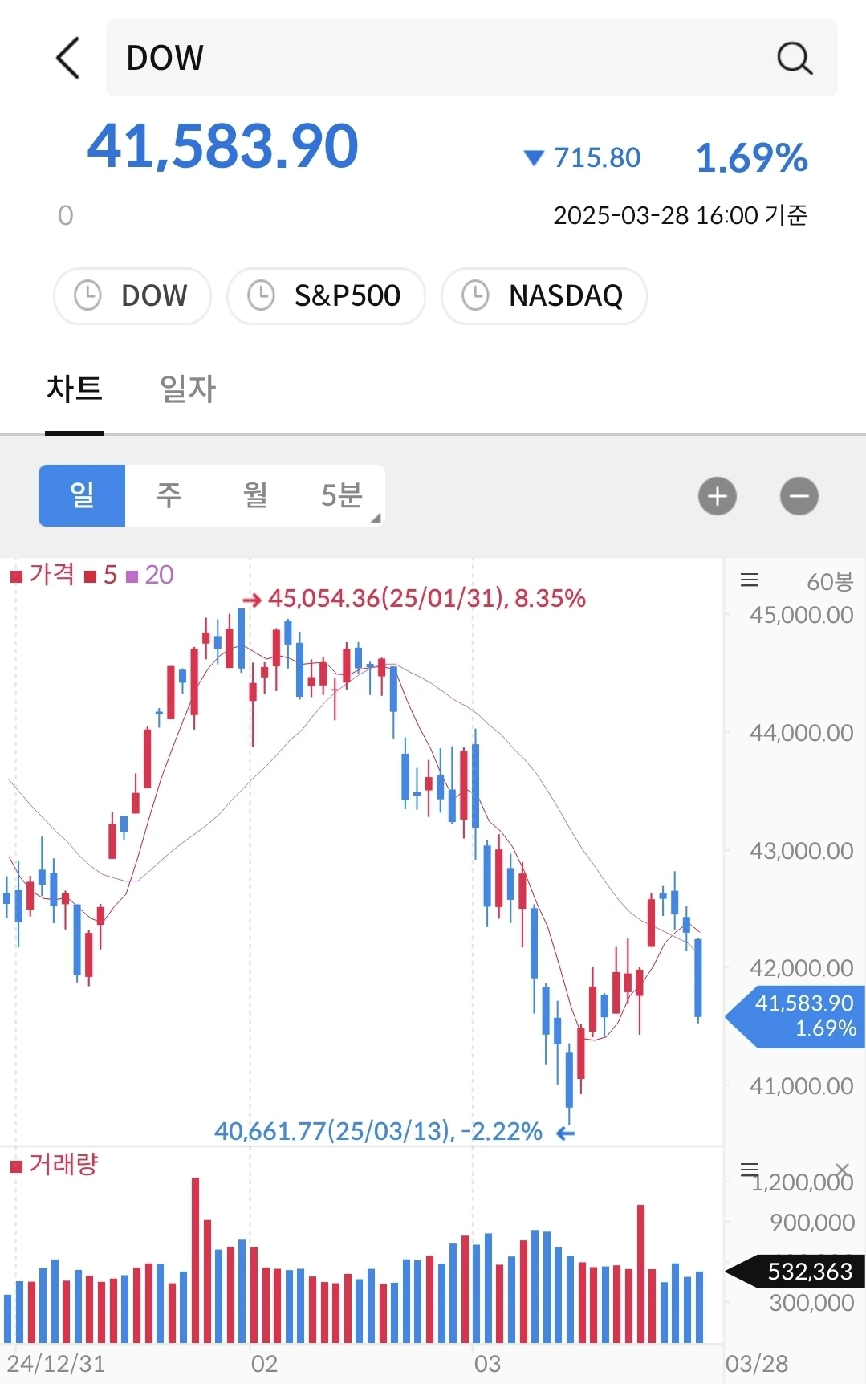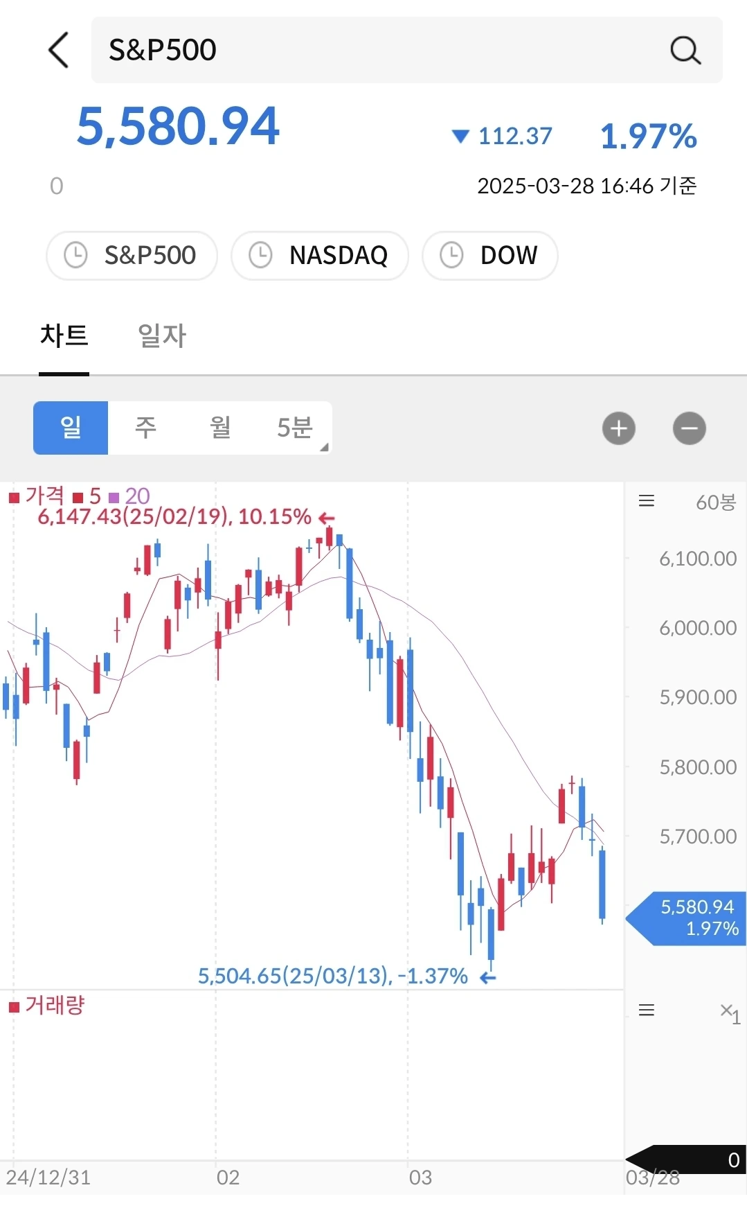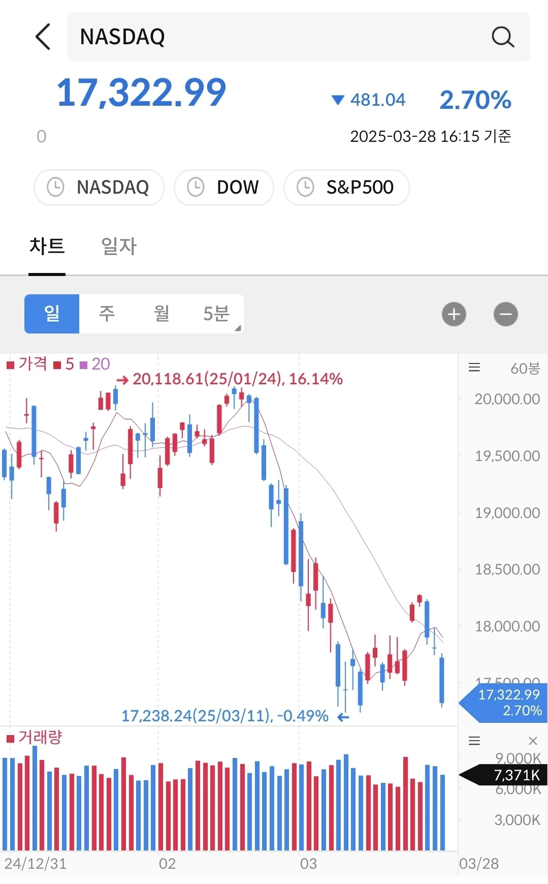 다우지수와 동일하게 3월 중순에 큰폭으로 하락 후 금요일 다시 큰폭으로 하락을 했다. 이 또한 분할 매수의 기회이다. 현금이 있으면 사도 좋을 때이다.