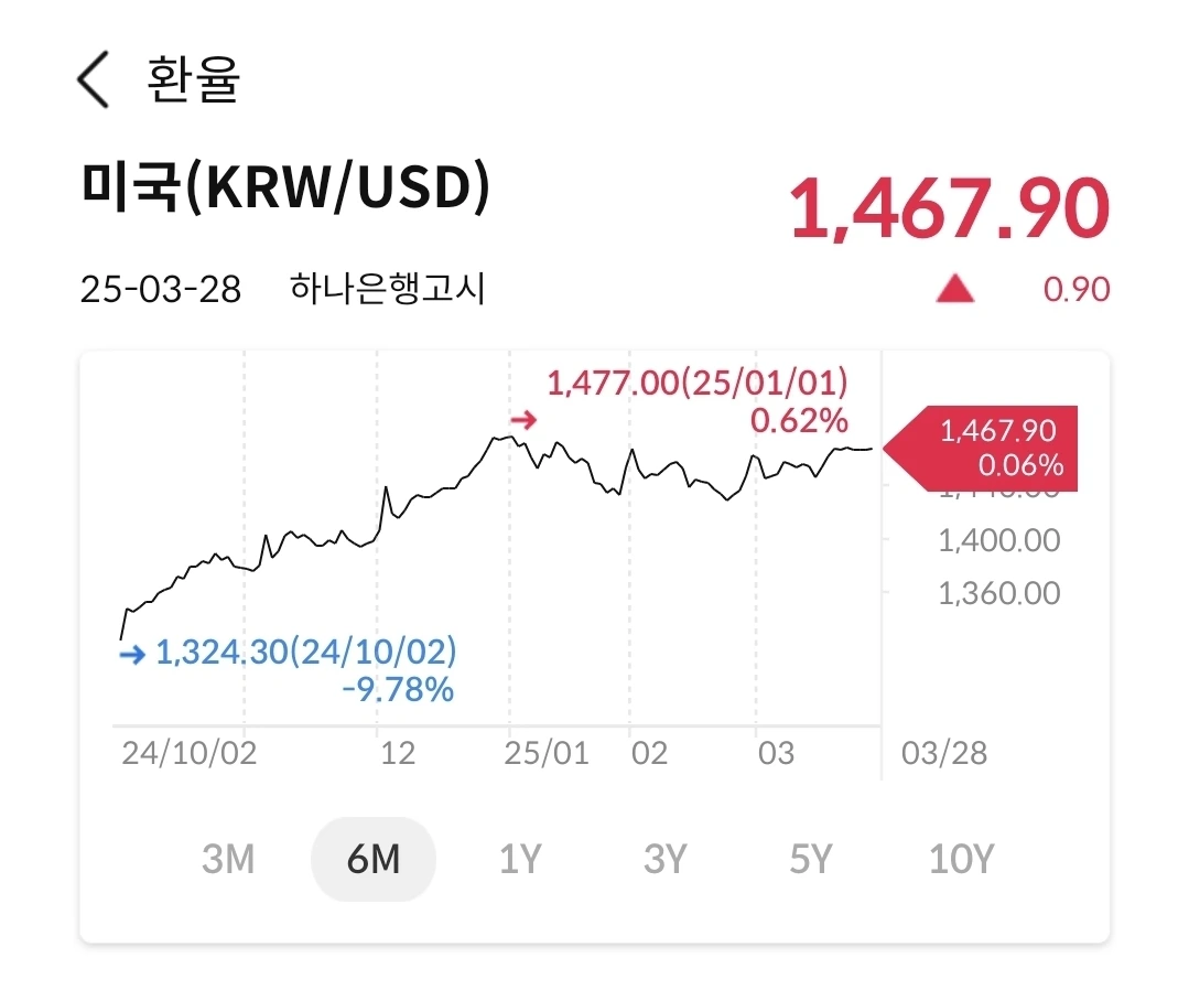 지난 6개월을 보면 꾸준히 우상향 중이다. 1월에 최고점을 찍고, 내려가지 않고 유지 중이다. 다시는 1300원대로 돌아가기는 어려운 상황이니, 1400원대 초반이면 달러를 매수해도 좋을 듯 하다. 이러다가 1500원대를 넘어가는 것이 아닌가 생각이 든다.