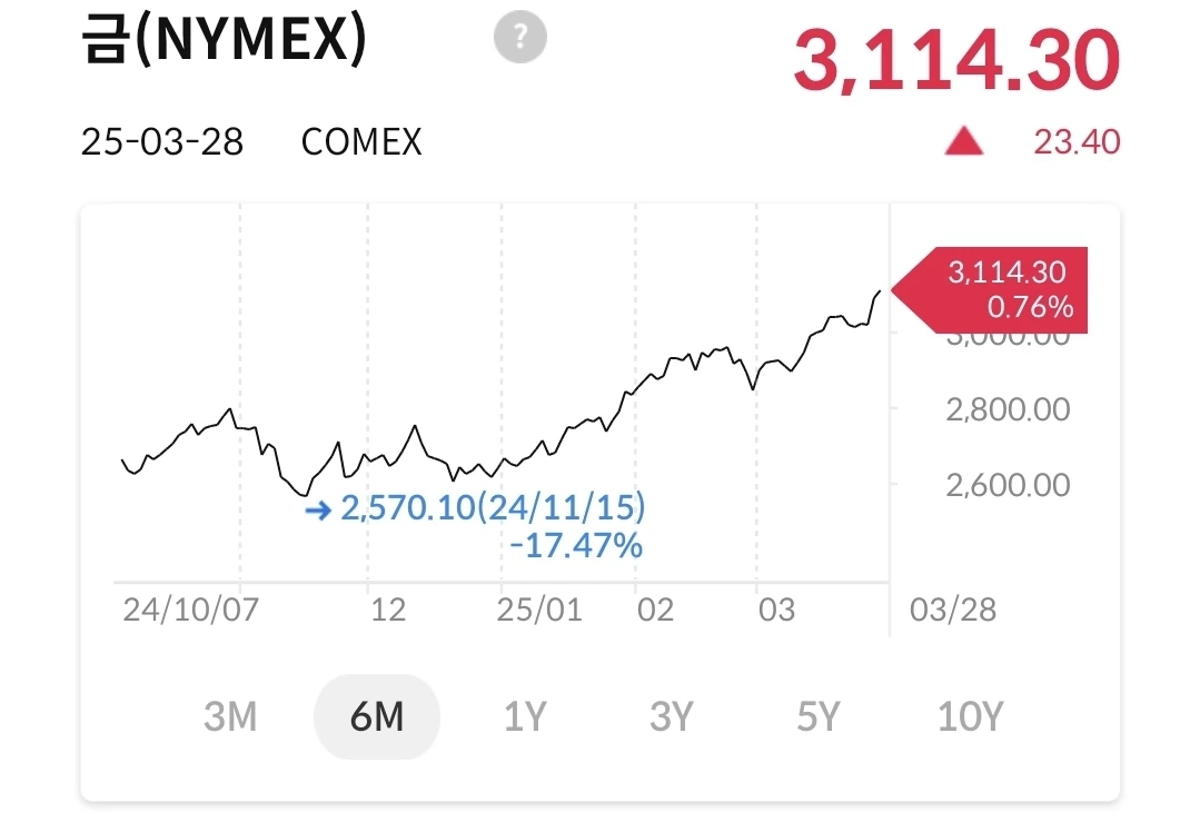 금가격은 안전자산 선호 심리에 따라서 3천불대를 넘어서 지속 상승 중이다. 진정한 우상향으로 움직이는 중이다. 금가격의 상승은 여러가지 문제를 야기할 수 있다. 이 상황이 지속된다면 물가도 출렁일 수 있다. 그러나, 당분간은 꾸준히 우상향할 것으로 보인다. 예의 주시하자.