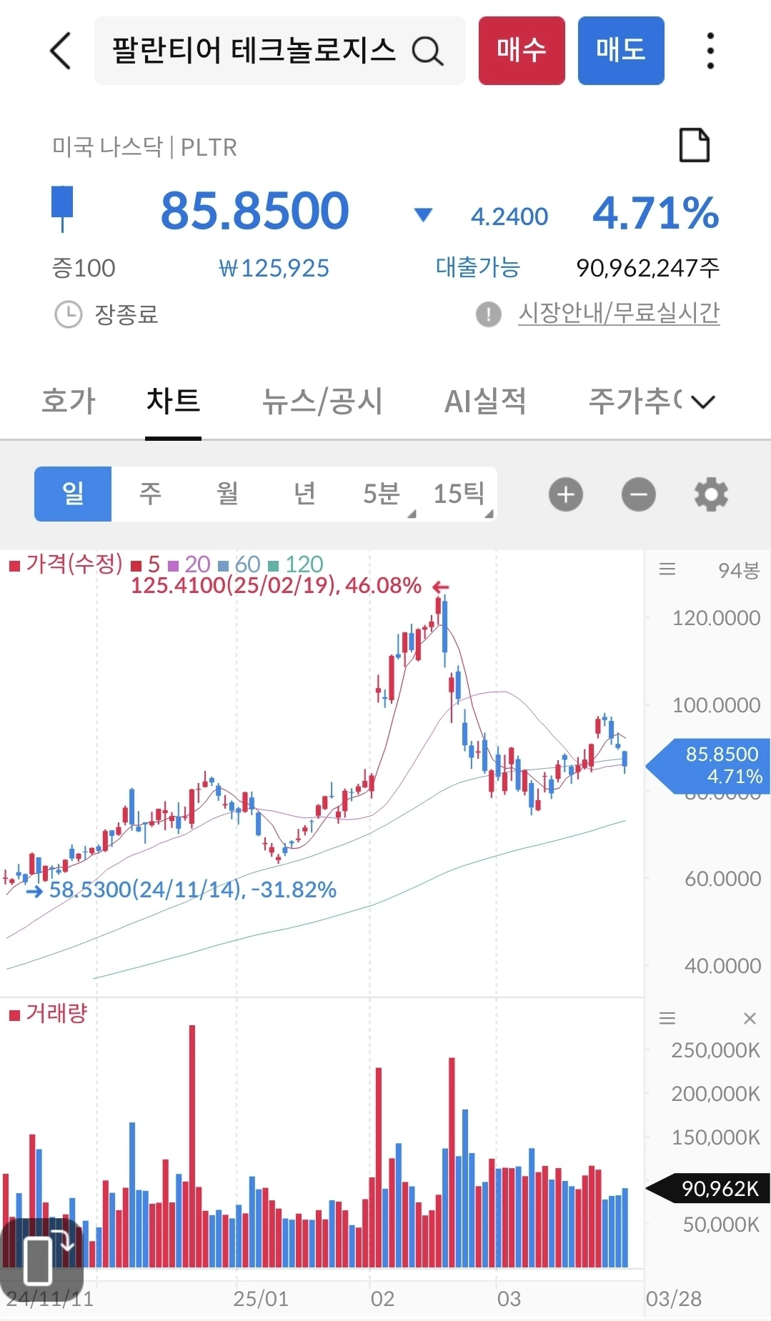 3월 중순에 바닥을 찍고 상승 중이었고 지난 금요일에 큰폭으로 하락을 했다. 퇴직연금 계좌에서 공격적으로 매수를 했다. 최근 3개월간 보면, 많이 하락된 상황이다.