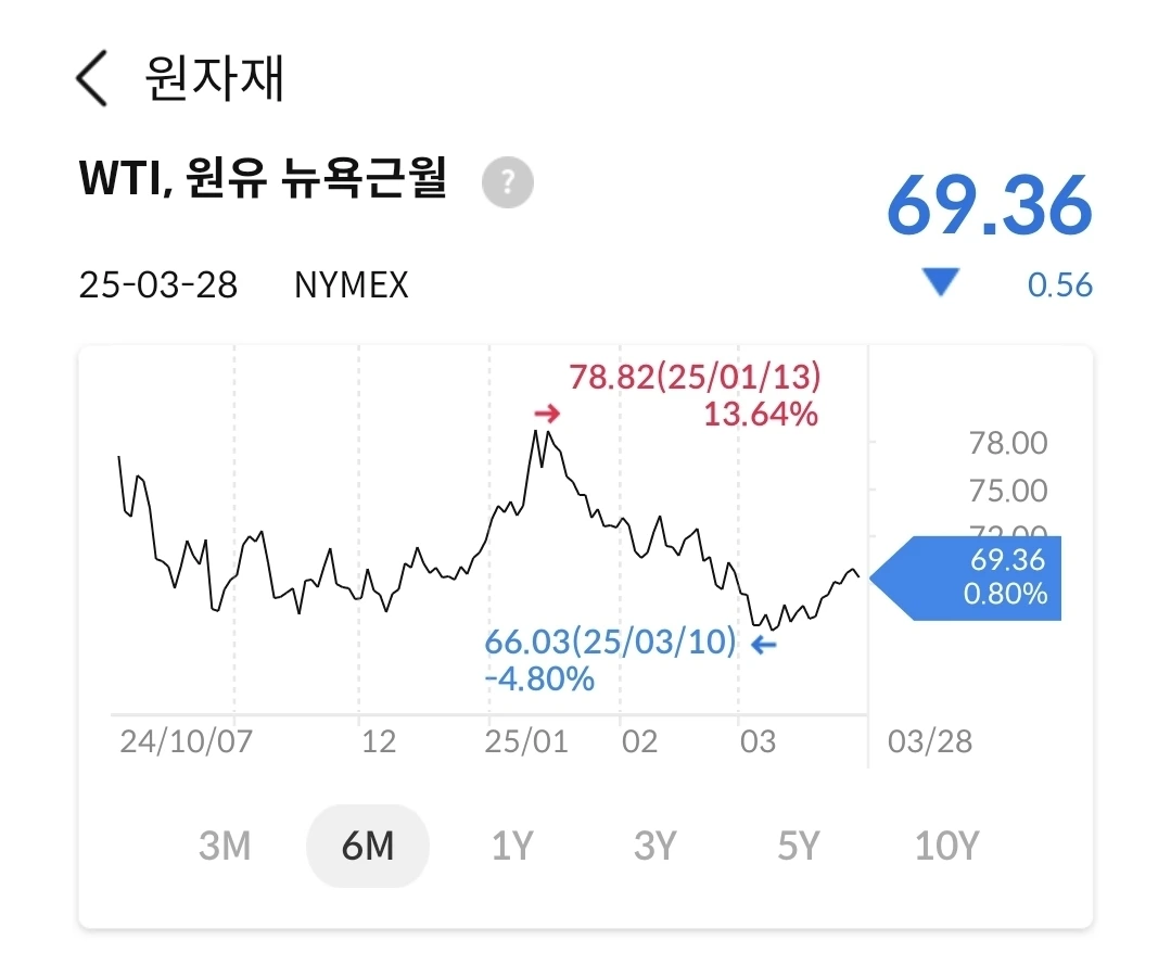 1월에 78불까지 상승 후에 지속하락 후 60불대에서 등락을 반복 중이다. 중동리스크와 트럼프 관세 이슈 등 상승할 재료는 많으나, 시장에서는 쉽사리 상승을 못하고 등락을 반복 중이다. 올해는 60불대에서 등락을 반복할 듯 하다.