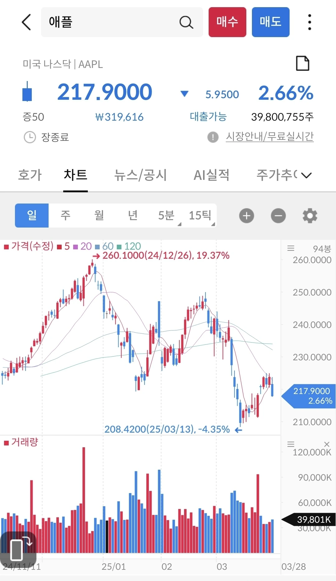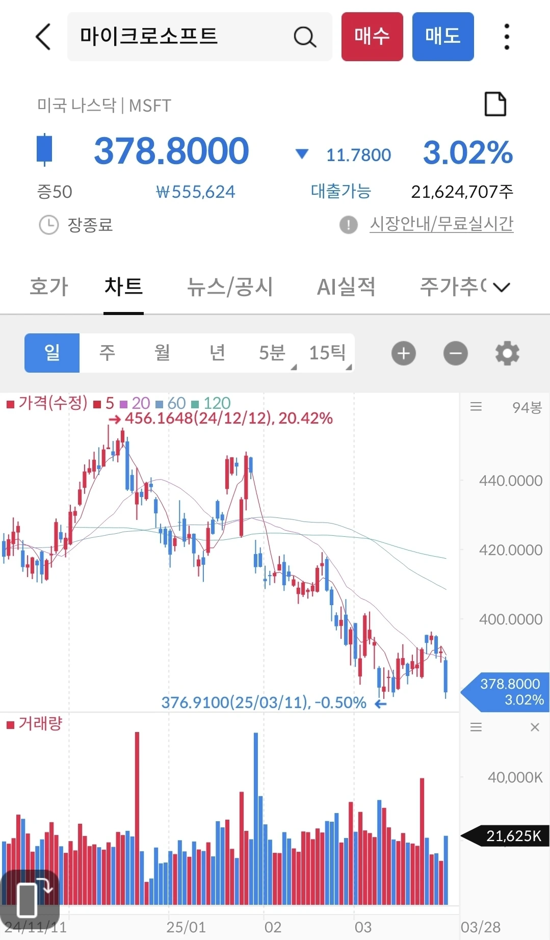 그동안의 상승을 다 반납하고 이제는 다시 시작하는 기분이다. 돈이 있다면 매수해도 좋을 듯 하다. 그러나, 나는 마소를 사기로 마음을 먹어서 마소의 가격 추이를 보는 중이다.