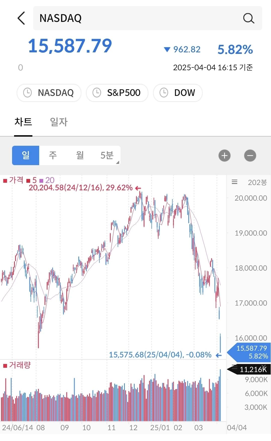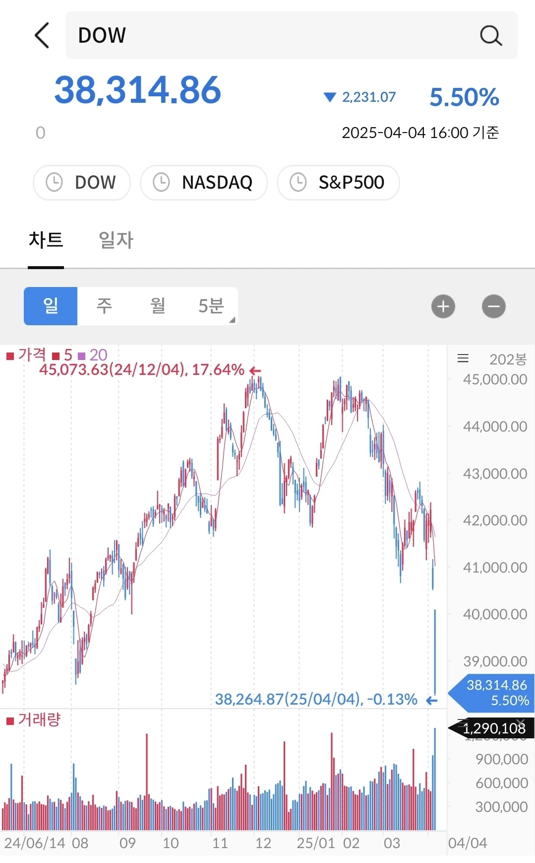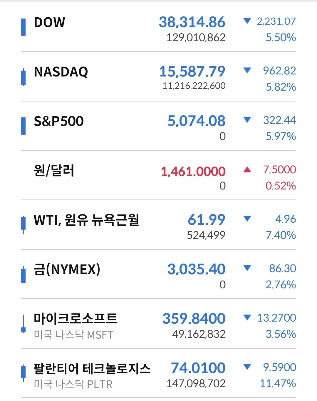위의 두 지수보다 더 수직 하강을 했다. 깊이가 깊은 절벽이 아닐까 생각이 든다. 이렇게 큰 미국시장이 한 순간에 이렇게 무너질 수도 있다는 것을 보여줬다. 가능하다라는 생각과 주식은 어느 방향으로 움직일지 모른다. 그리고, 어디가 바닥인지도 모른다.