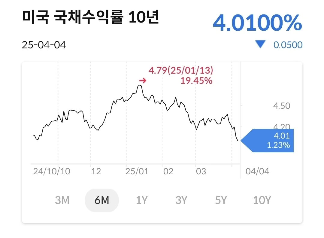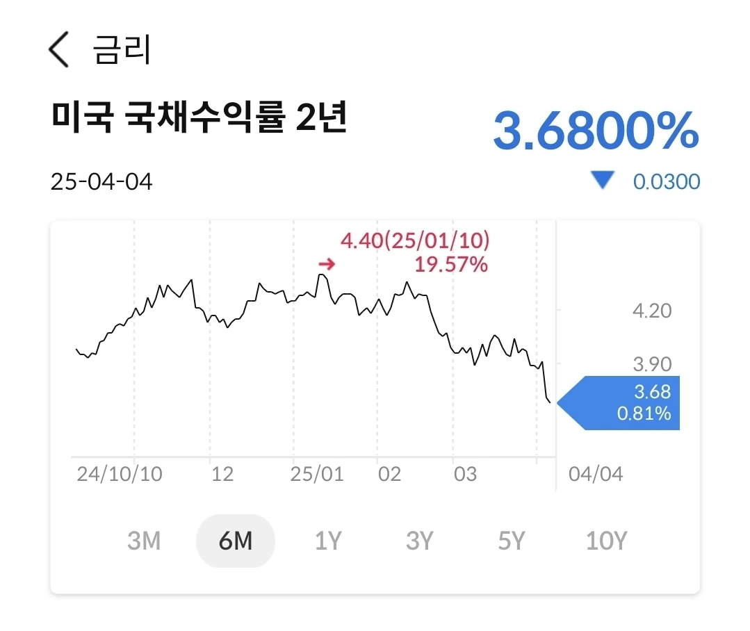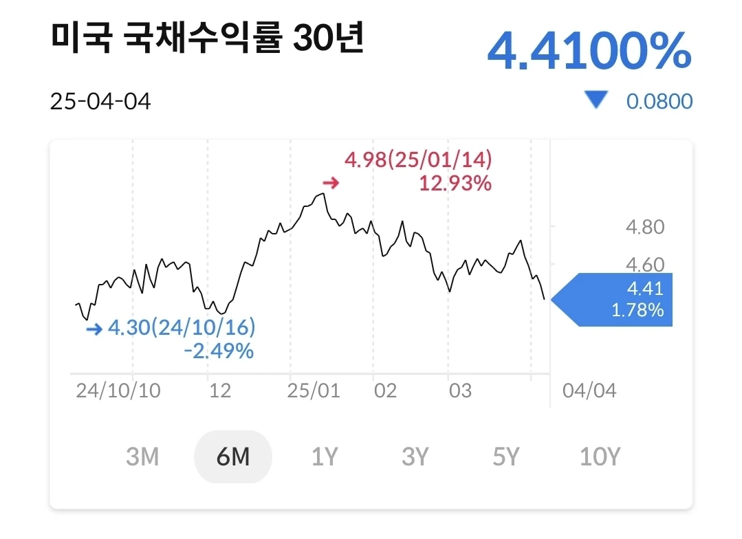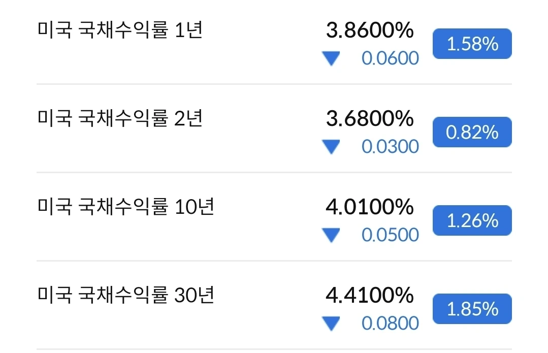 2년물 국채 수익률은 3.6%대로 진입했다. 트럼프 취임 때 4.4%를 찍고, 그 후로 지속하락하더니 3% 대이다. 10년물과 30년물도 하락 추세이다. 고점대비 많이 하락한 상황이다.