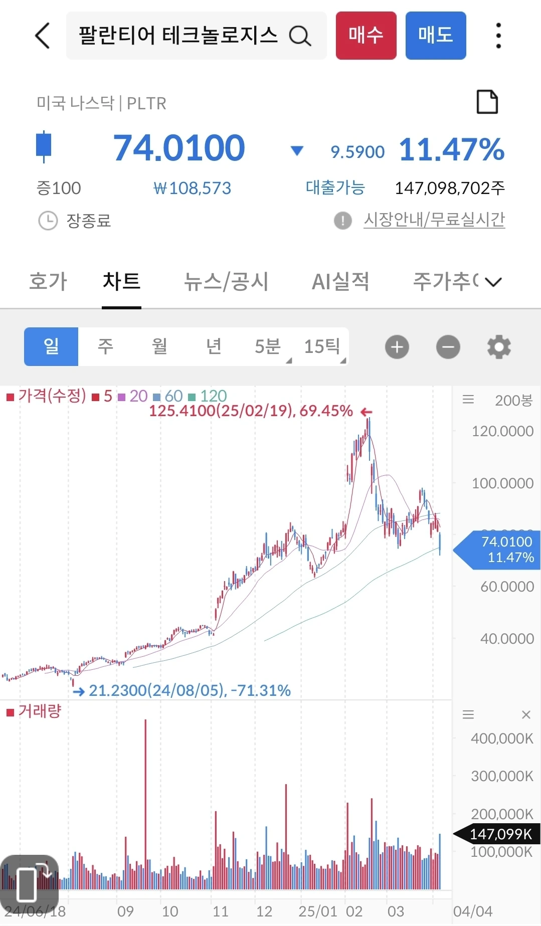 애플 7.29% 하락에 비하면 아주 양호하다. 선방했다고 이야기 하는 것이 맞다. 작년 12월 이후로 하락 추세인 것은 맞다. 요즘에 AI 데이터센터 과투자로 인해서 어려운 시기이기는 하나, 향후 비즈니스에는 큰 도움이 될 것이라 생각된다. 마이너스로 보유 중이다.