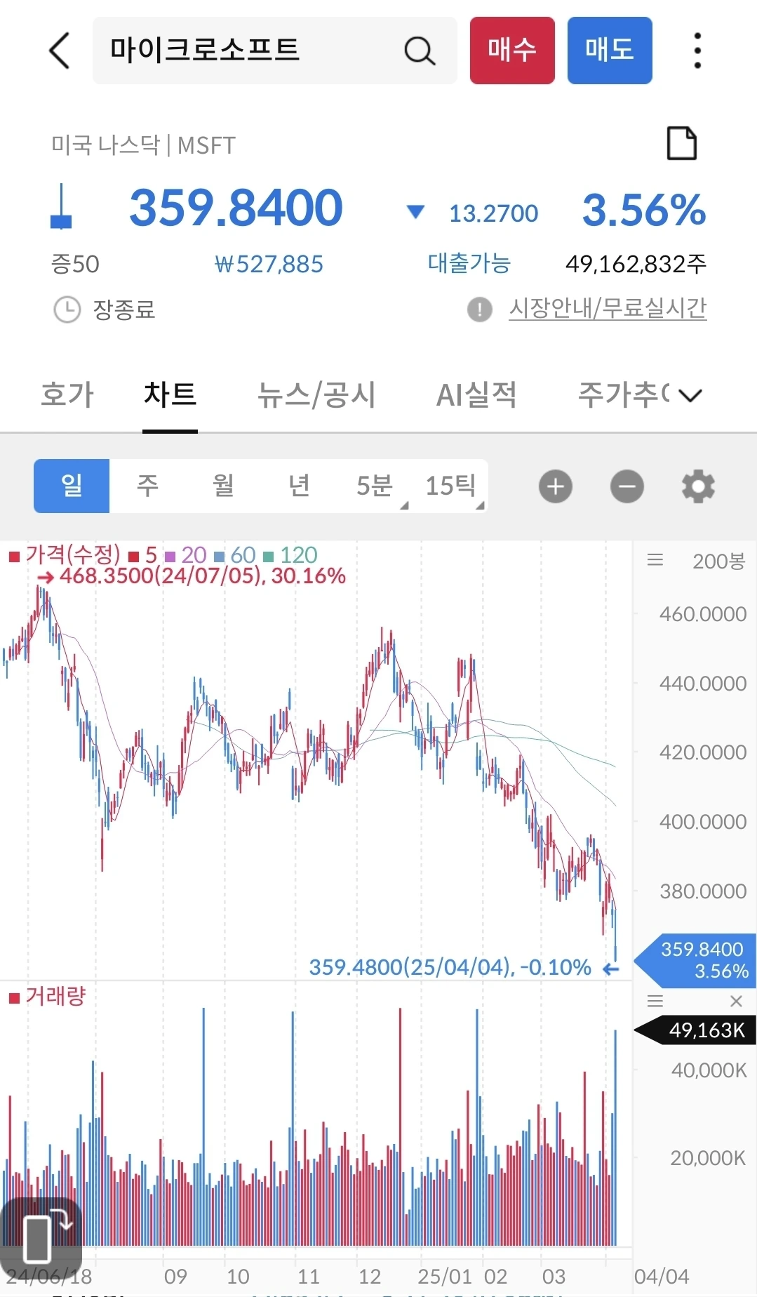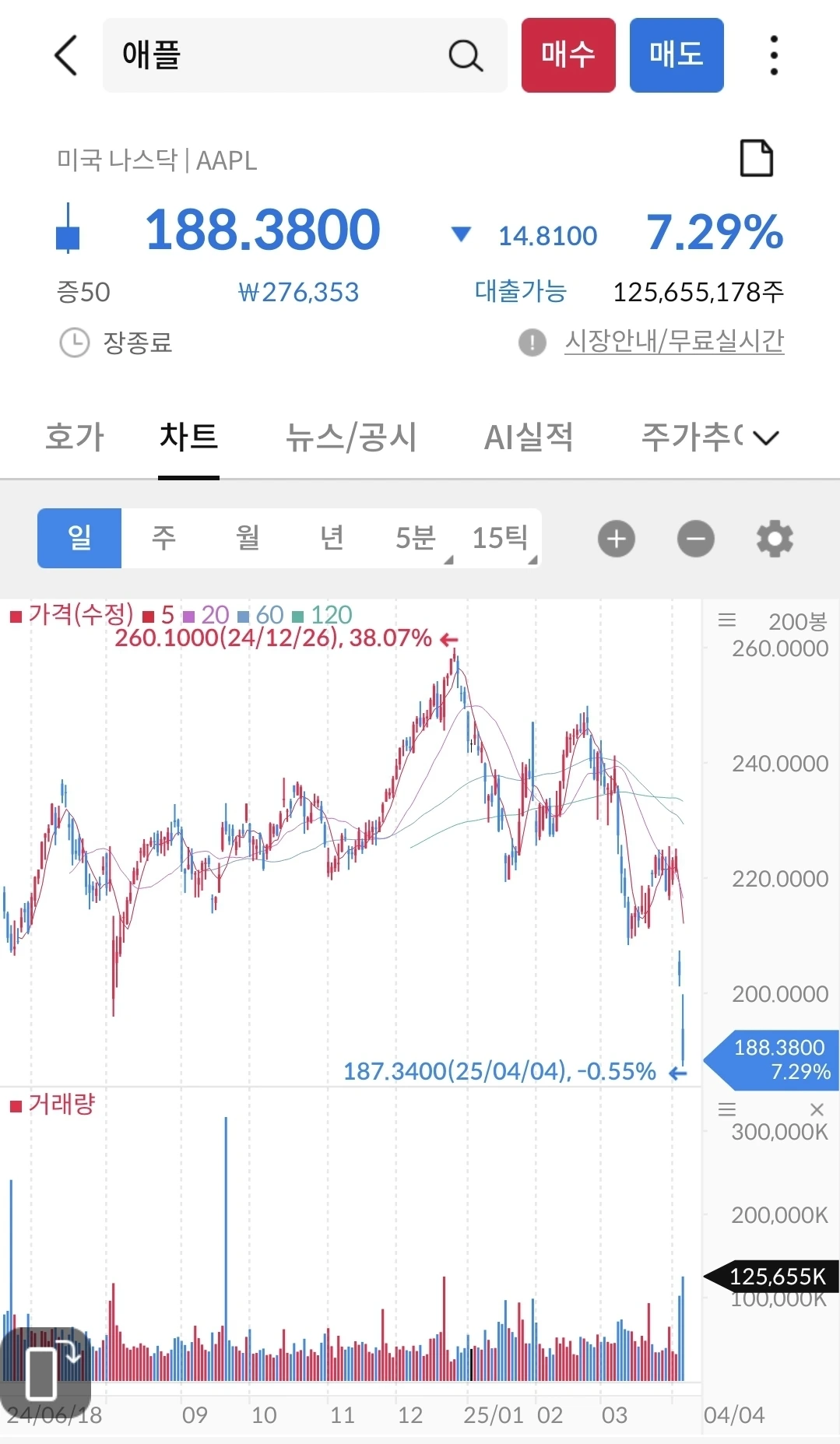 애플 가격은 중국 관세 확정 후에 수직 낙하했다. 미국 정부에서 예외 관세를 받을려고 노력한다지만, 과연 트럼프가 대가없이 무관세로 만들어 줄 것인지 알 수 없다. 시장에서는 불안한 요소가 더 많다고 생각하는 듯 하다. 작년에 애플에서 마소로 갈아타기를 잘했나라는 생각이 든다.