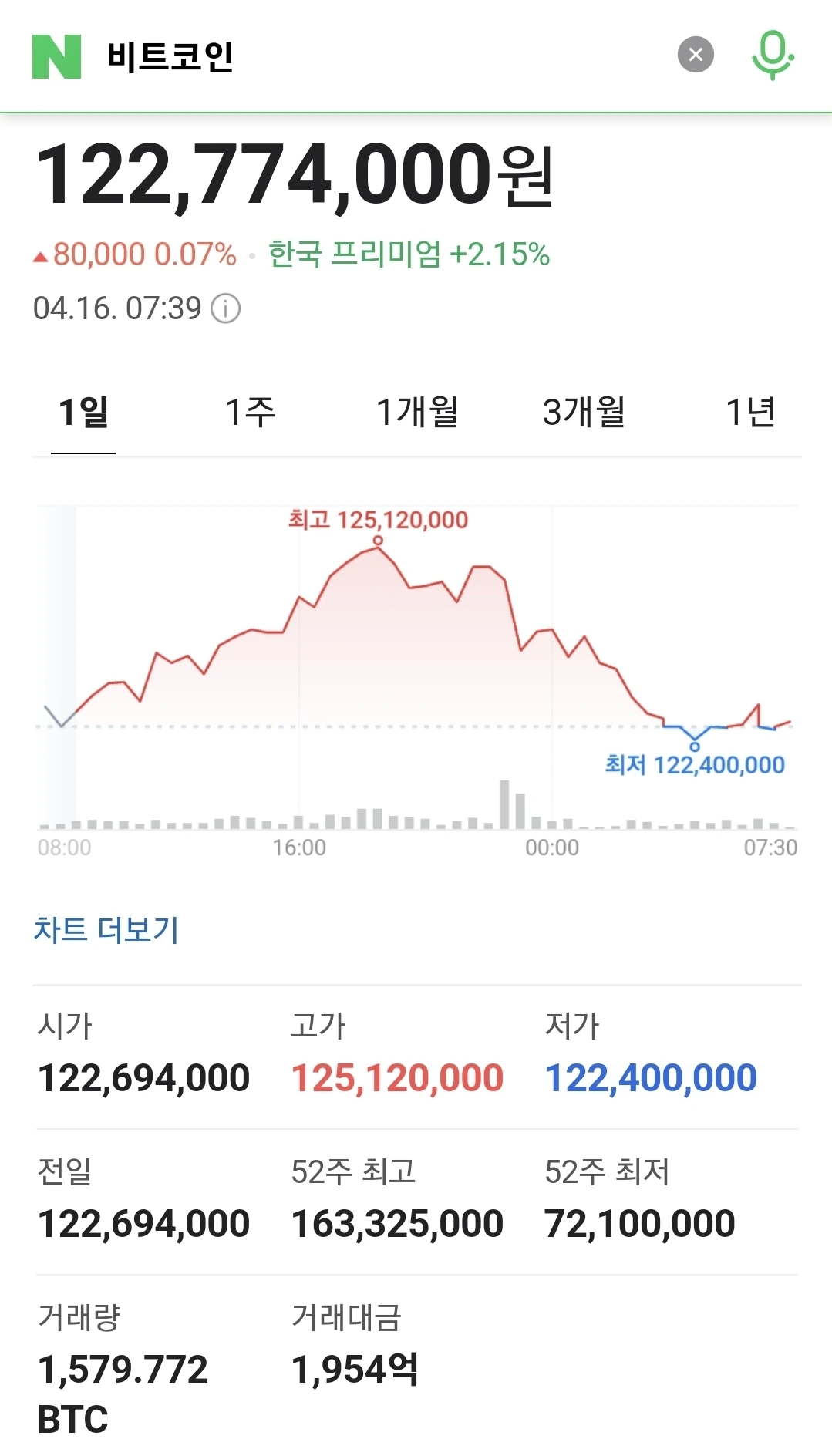 1) 비트코인, 1.45% 하락한 1억2천만원