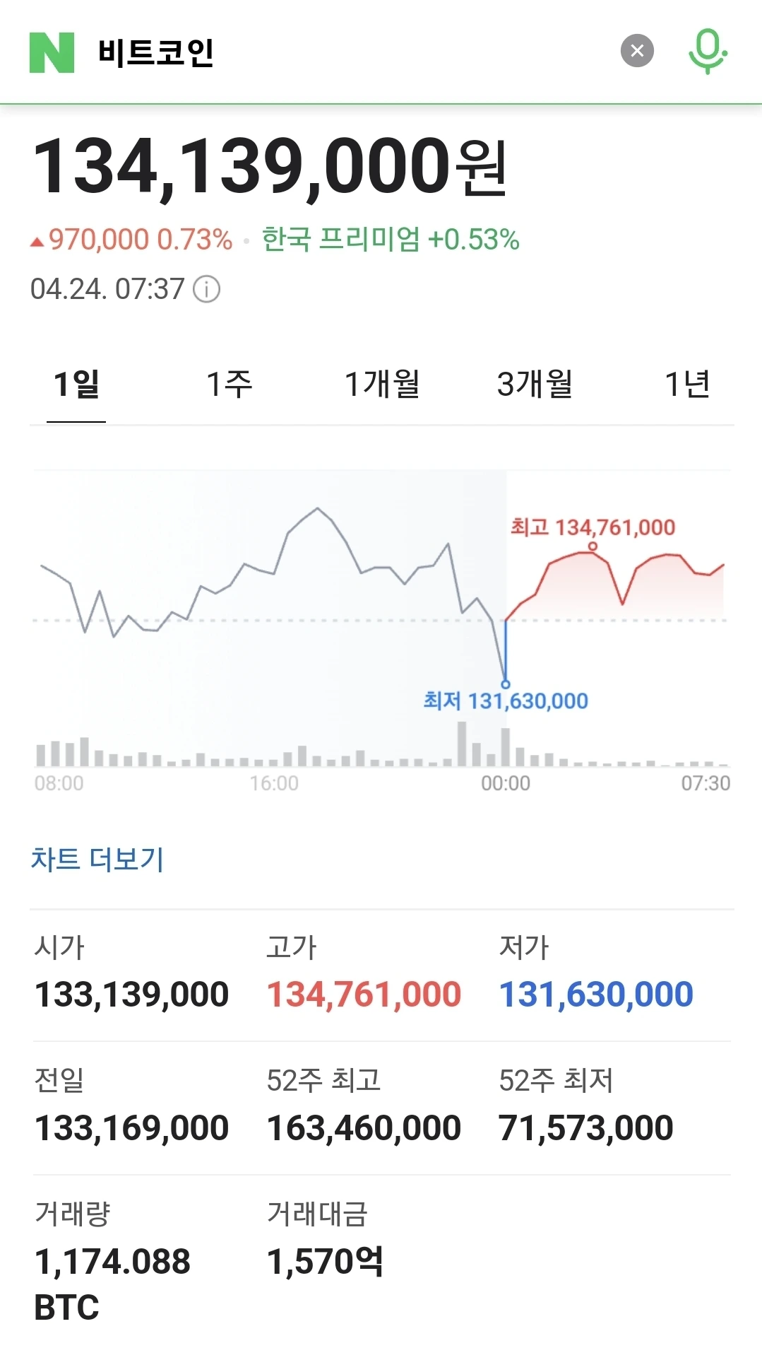 1) 비트코인, 0.68% 상승한 1억3400만원대