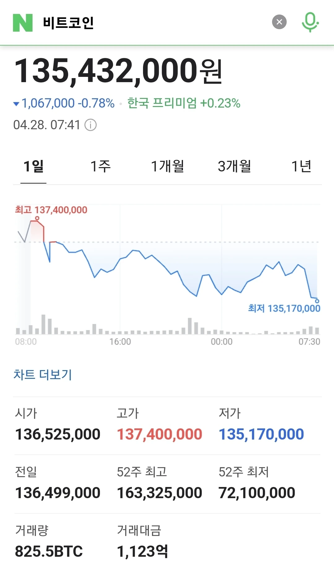 1) 비트코인, 0.26% 하락한 1억3500만원