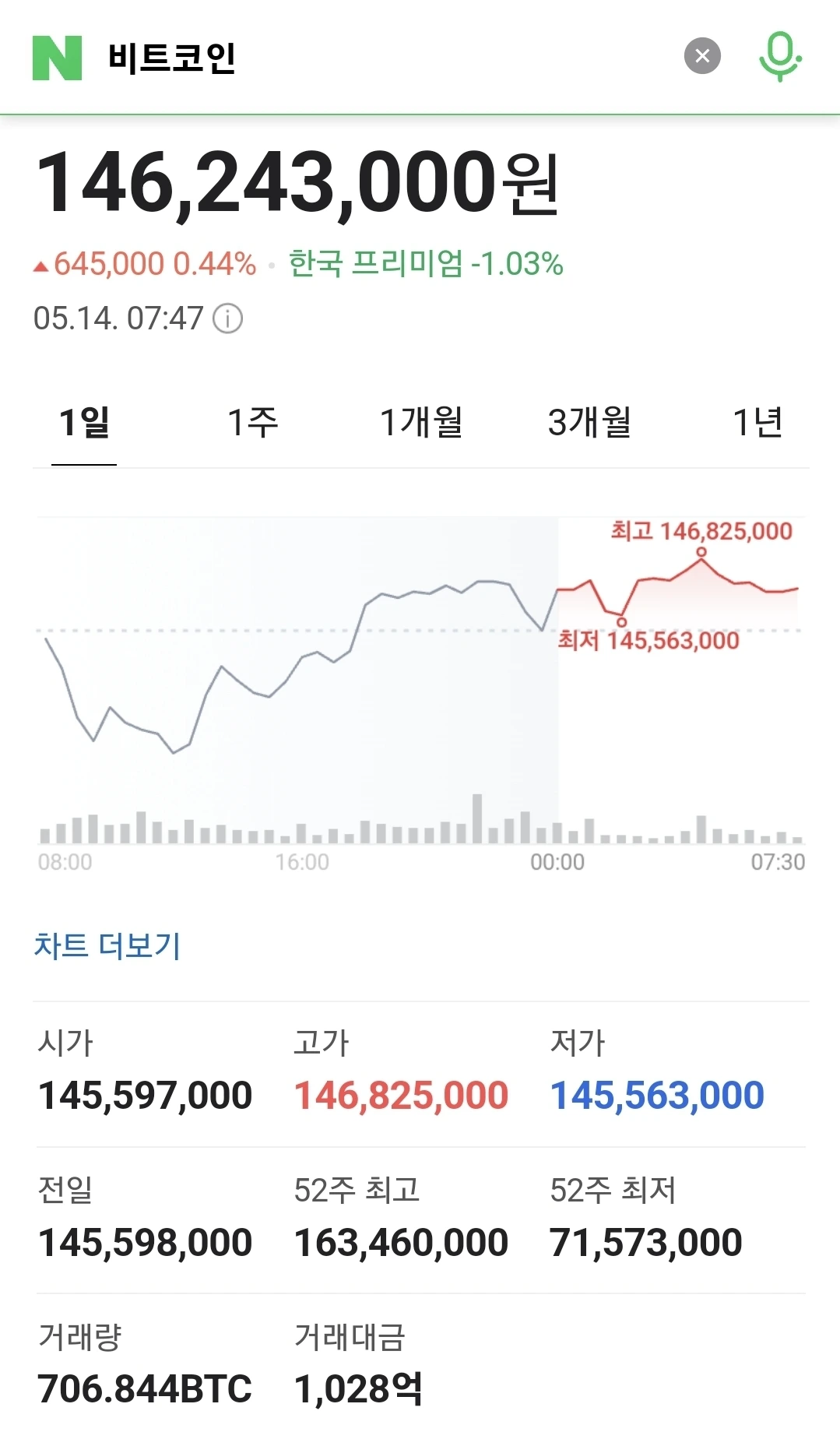 1) 비트코인, 0.34% 상승한 1억4609만원