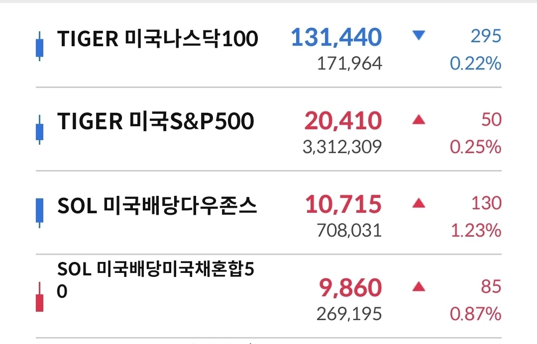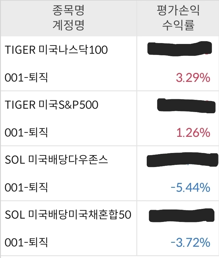 이번 주 TIGER 나스다과 S&P500 은 우상향 중이다. 그동안 떨어졌던 것을 모두 만회할려는 듯 보인다. 바닥이라 생각할 때 많이 분할매수 하기를 잘 했다. 지금 다우지수와 미국채는 아직 회복이 안되었다. 그래서, 분할매수로 집중 매수 중이다. 전체 비중을 감안하여 3:3:1:3 비율로 맞춰가는 중이다. 아직은 나스닥 비중이 약간 높다. 많이 떨어졌다고 생각해서 집중 매수를 했었다.