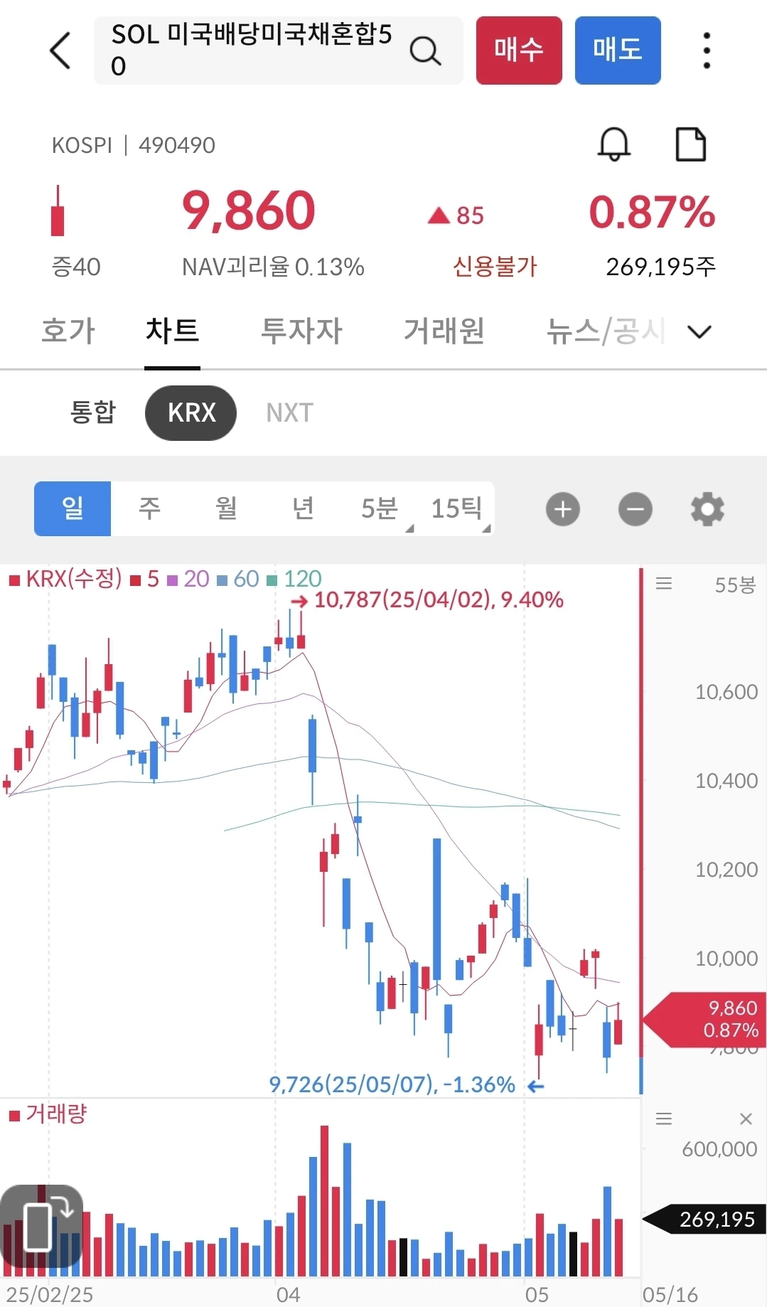 만원에 상장을 했는데, 현재는 9800원대이다. 미국채 가격이 많이 떨어졌다는 의미이다. 트럼프의 여러가지 오락가락 정책들이 미국에 대한 신뢰를 크게 떨어트리고 있다. 그러나, 미국채의 신뢰가 한번에 떨어지지는 않고, 아마도 일정 시간이 필요할 것이다. 그래도 파월의장과 트럼프가 미국채의 신뢰회복을 위해서 노력하지 않을까? 믿어보자.