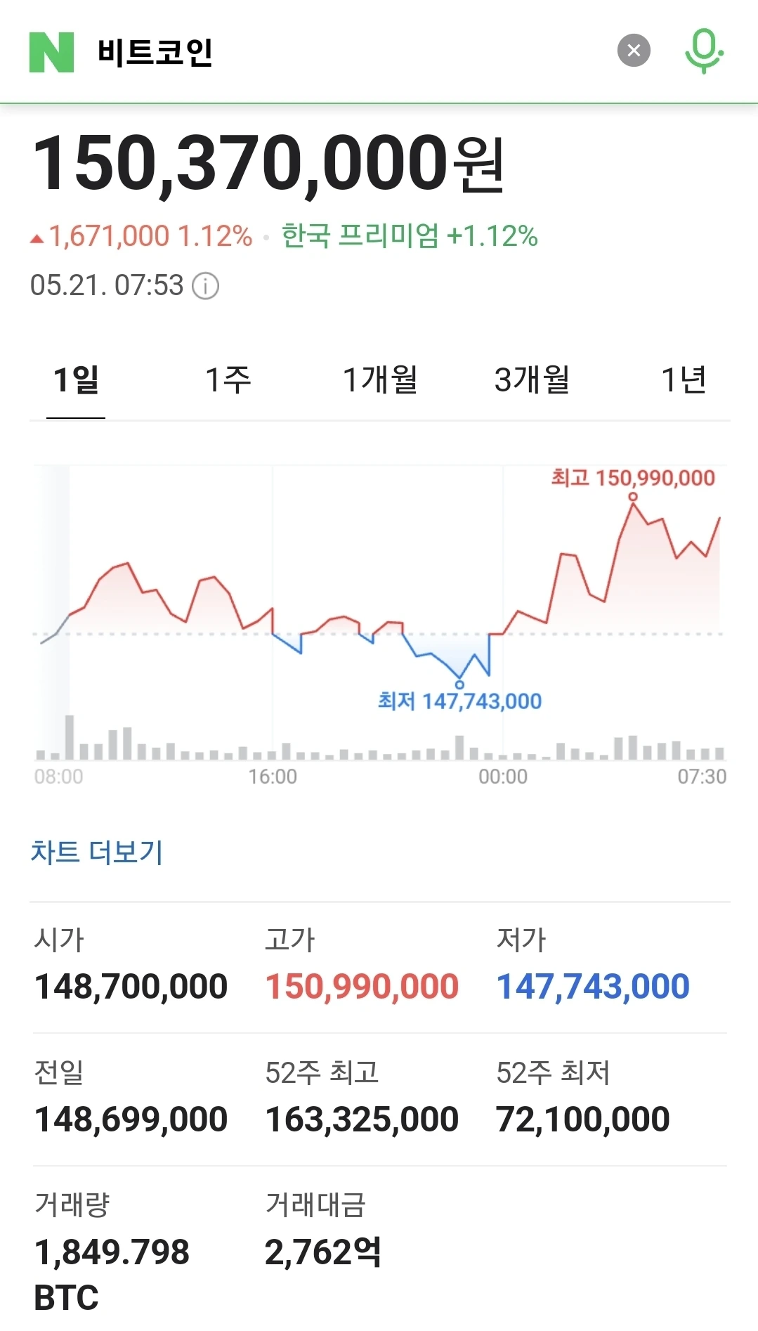 1억5천만원에 안착한 비트코인