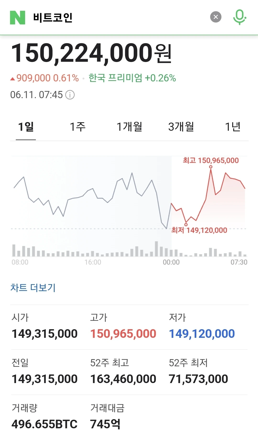 1) 비트코인, 0.92% 오른 1억5천만원대