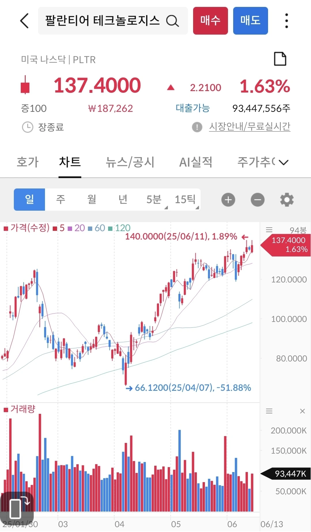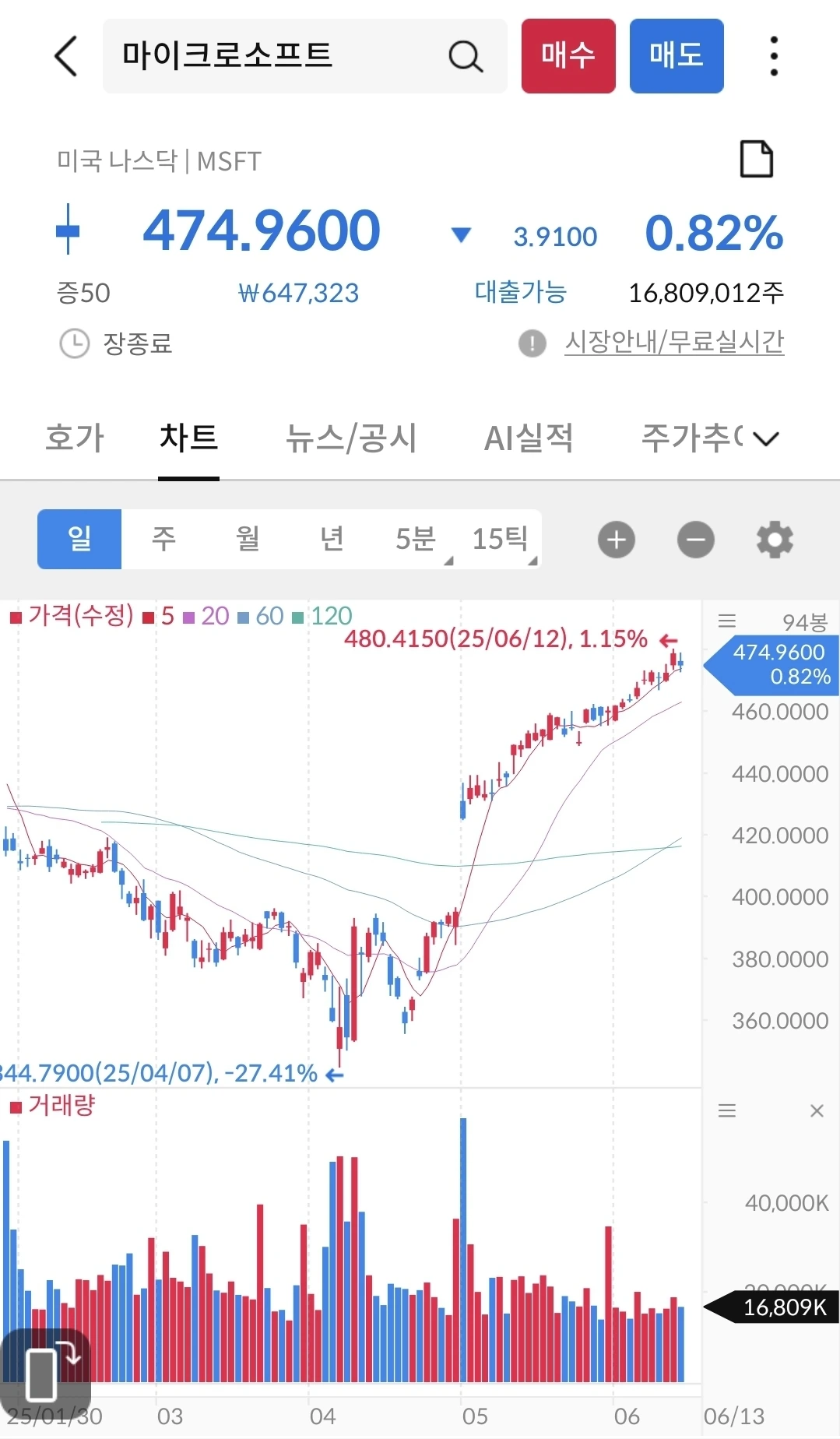 이스라엘 공격에 주가는 상승했다. 아마도 전쟁을 투자자들은 호재로 생각하나 보다. 전고점을 넘어서 꾸준히 우상향 중이다.