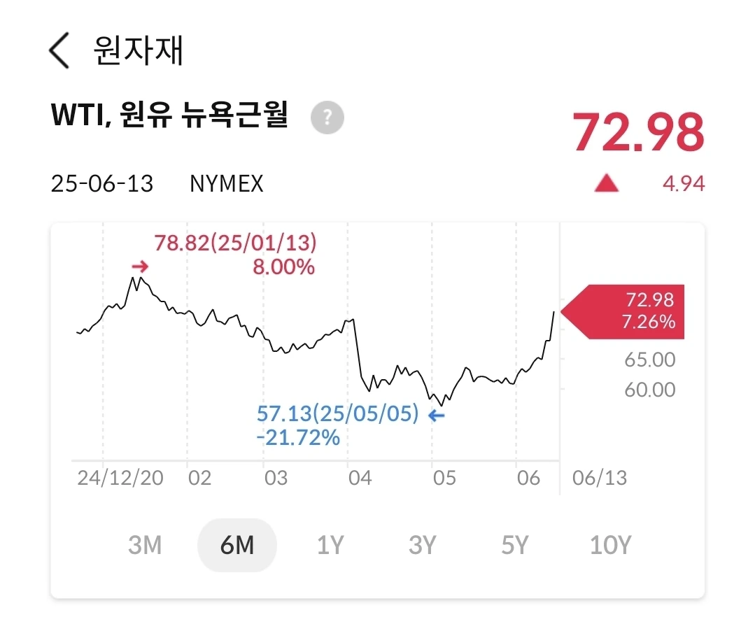 이스라엘 공격으로 급등하여 70달러를 돌파했다. 중동 전쟁의 방향에 따라 더 올라갈지는 두고 볼일이다.