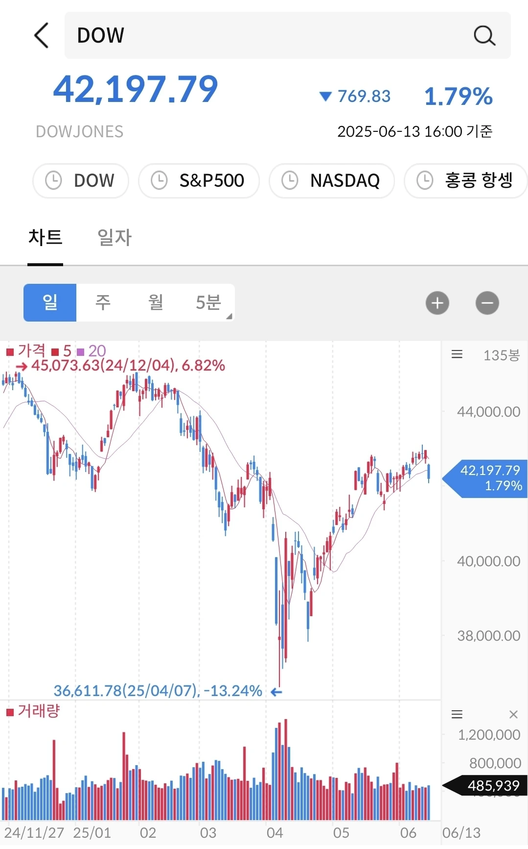 회복 중이나 아직 고점대비는 좀 더 상승이 필요하다. 나스닥과 S&P500에 비해서는 느리게 움직이는 중이다.그래도 길게 보면 우상향 중이다.