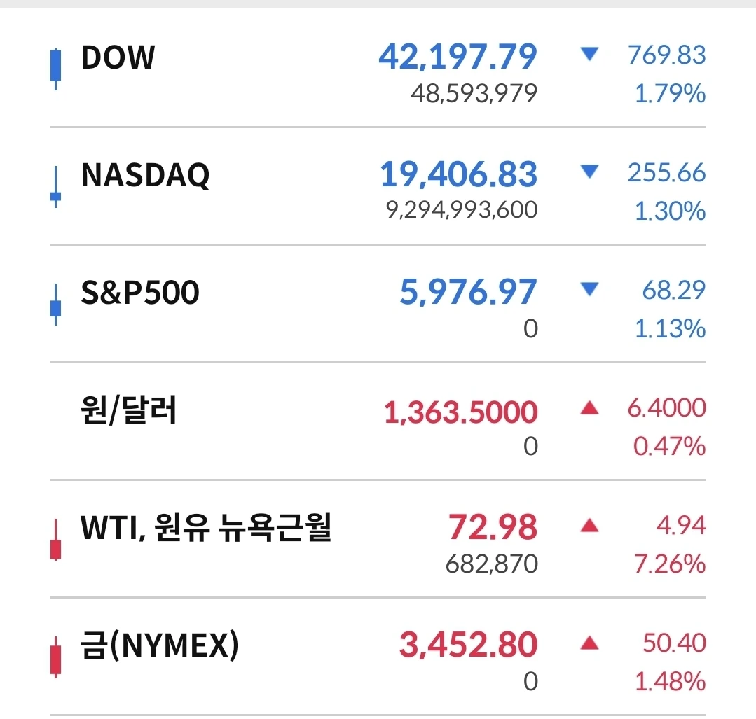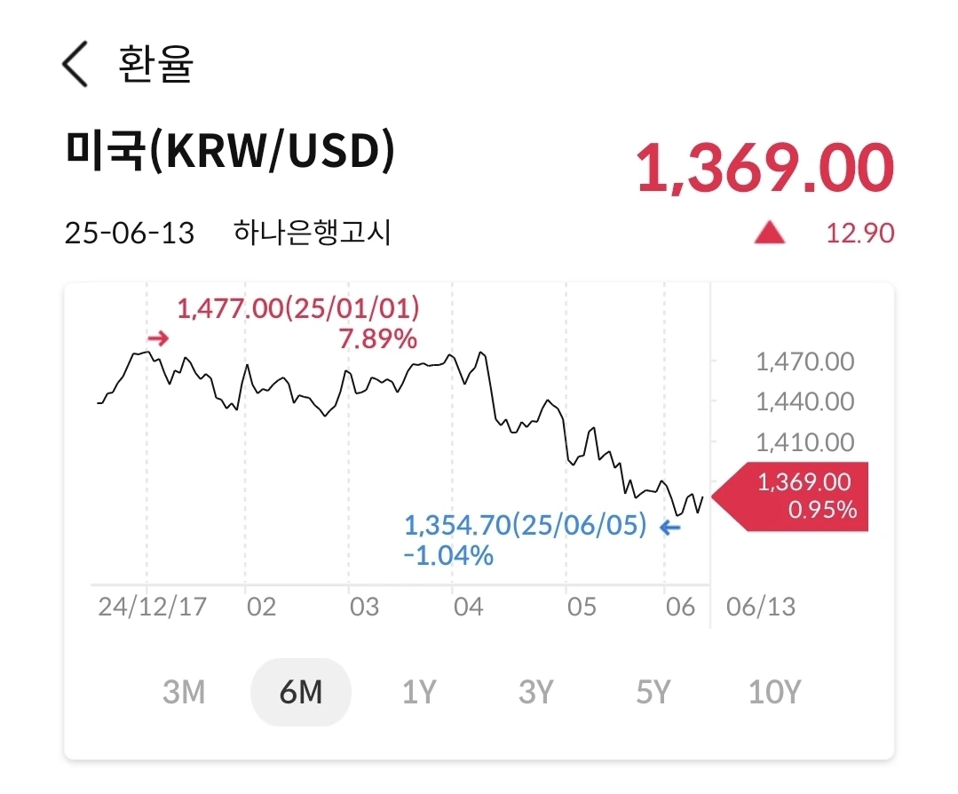 1350원까지 내려 갔다가 다시 1370원대 수준으로 올라 갔다. 불안한 중동정세 영향이다. 환은 어느 방향으로 튈지 예상은 안 되나 당분간은 우상향 하지 않을까 예측해 본다.