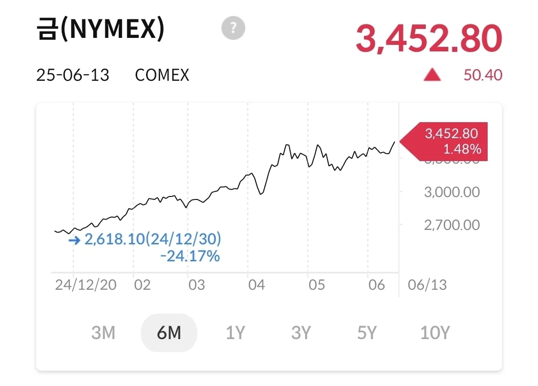 꾸준히 우상향 중이다. 중동 전쟁으로 인한 안전자산 선호 심리 영향이다. 연말에 3900선까지 올라간다고 하니 지켜 볼 일이다.