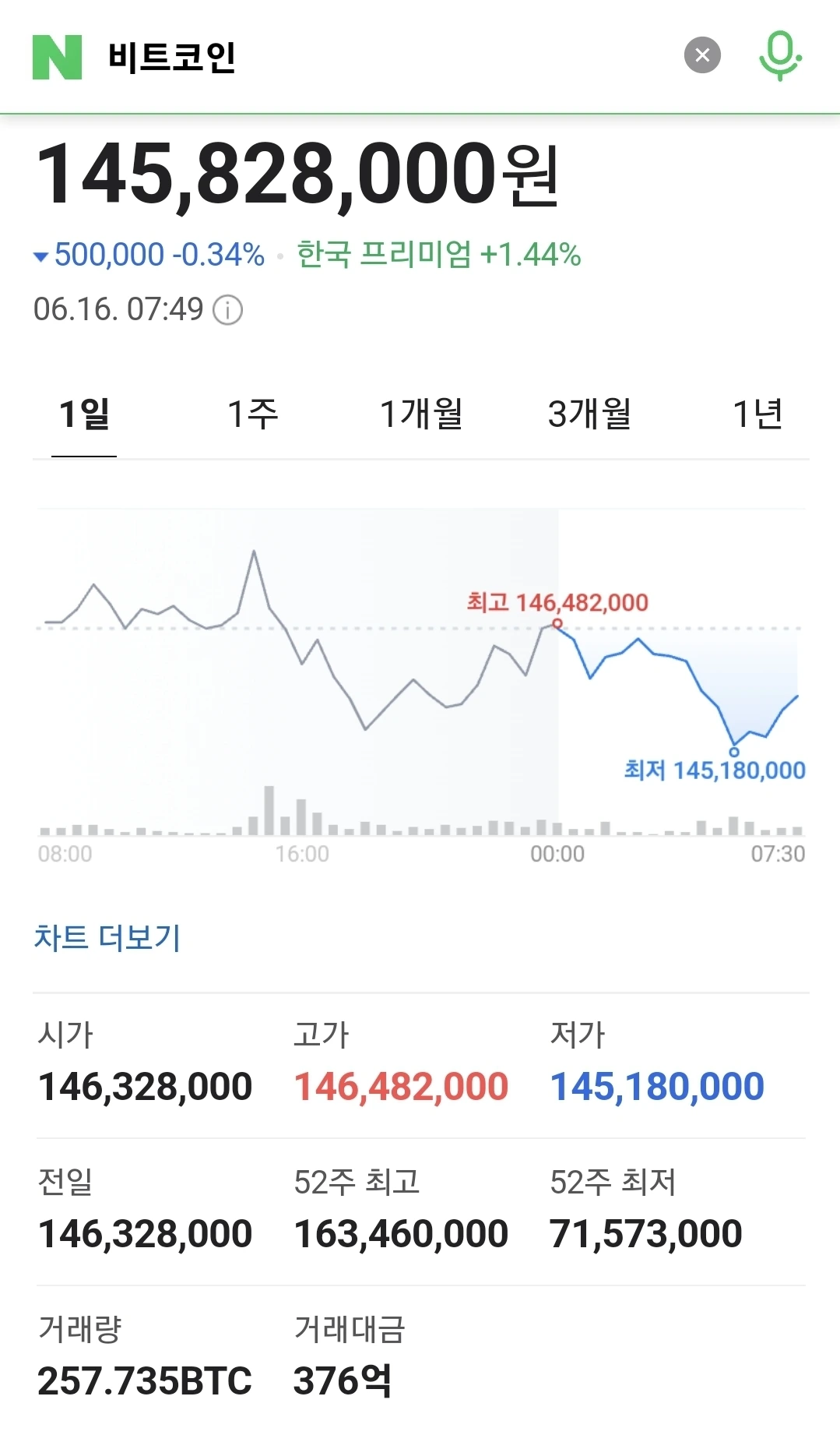 1) 비트코인, 0.21% 떨어진 1억4600만원