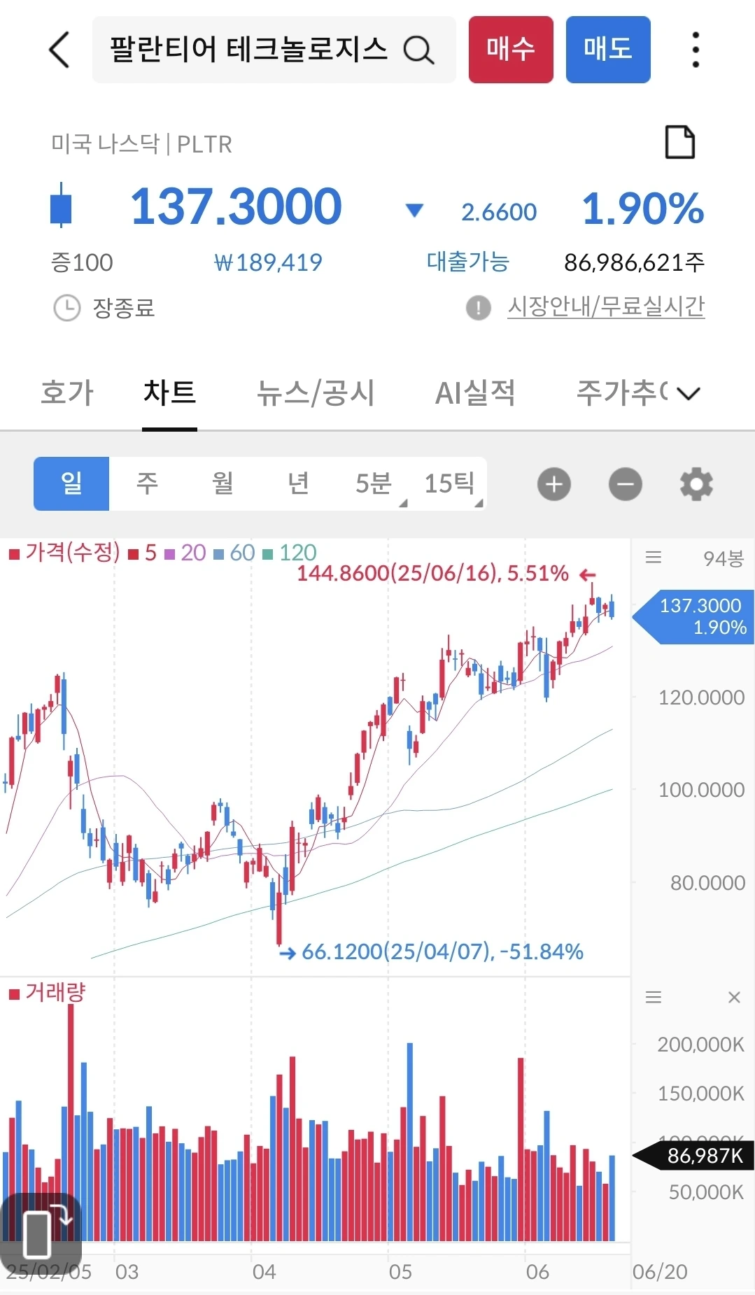신고가 경신했다. 144.86달러까지 상승했다가 지금은 등락 중이다. 이스라엘의 이란 공격으로 사람들의 심리를 자극한 듯 하다. 가격이 너무 높아져서 매수하기가 부담스럽다.
