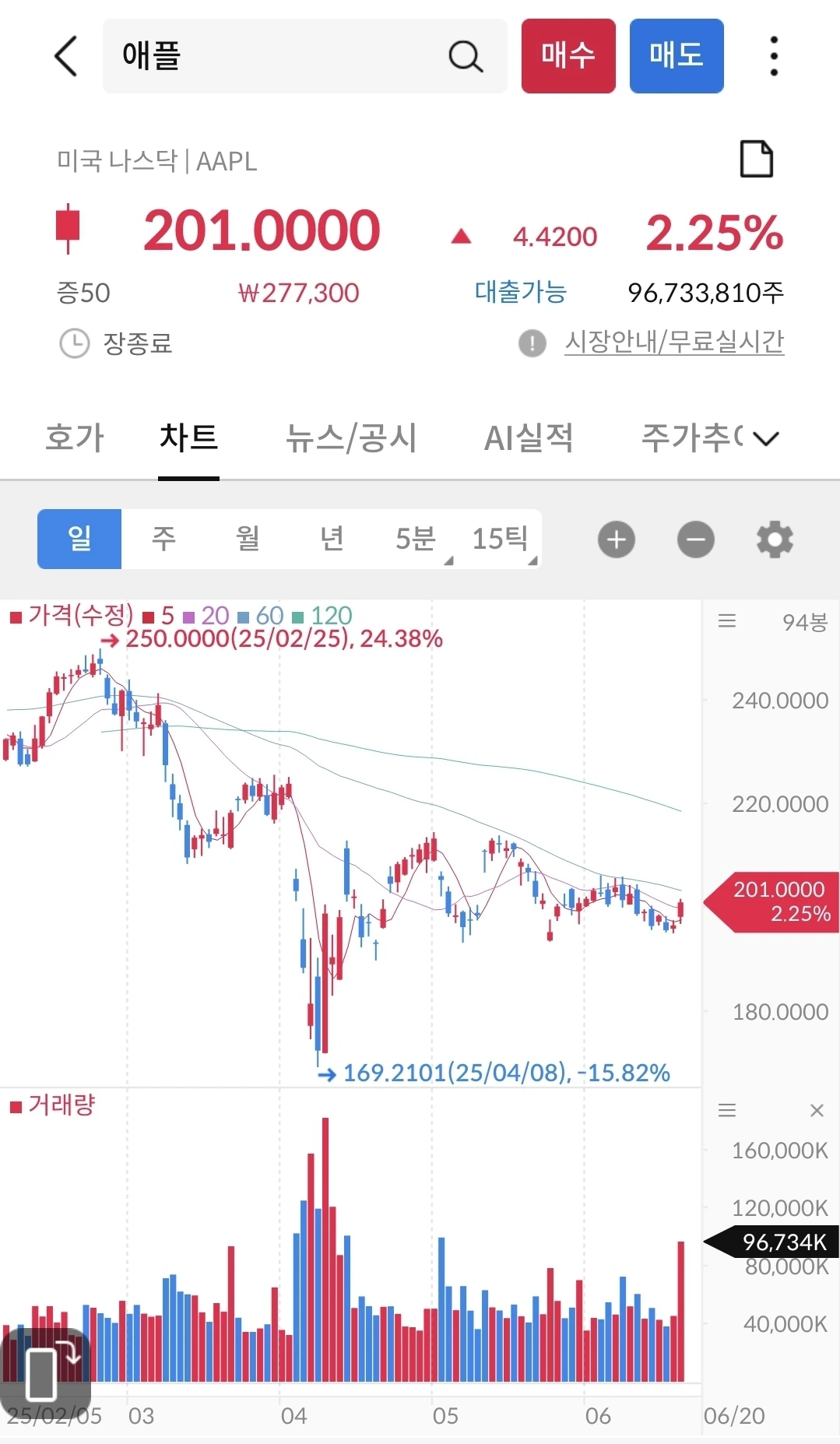 하락 중이다. 상승의 모멘텀도 보이지 않는다. 애플의 미래가 어떻게 될 지 궁금하다. 이제는 뭔가 치고 나갈 시점인데, 애플 경영진은 어떻게 대응할지 궁금하다. 지켜 보자.