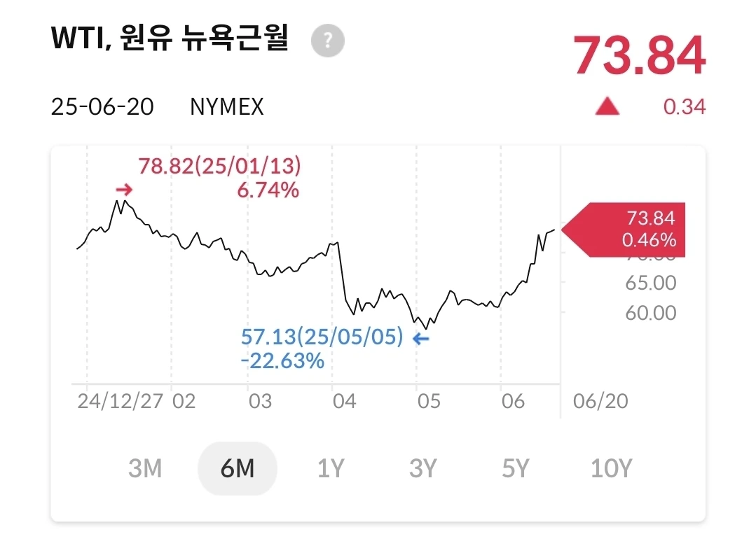 유가는 지속 상승 중이다. 이란과 이스라엘의 전쟁이 크게 영향을 주고 있다. 거기에 미국까지 개입을 했으니 이제는 얼마까지 상승할지 잘 모르겠다. 사우디가 증산을 통해서 가격인하를 추진하고 미국의 쉐일 업체들을 죽일려고 했는데, 결국은 전쟁이라는 악재 앞에서 상황은 반전되는 중이다.