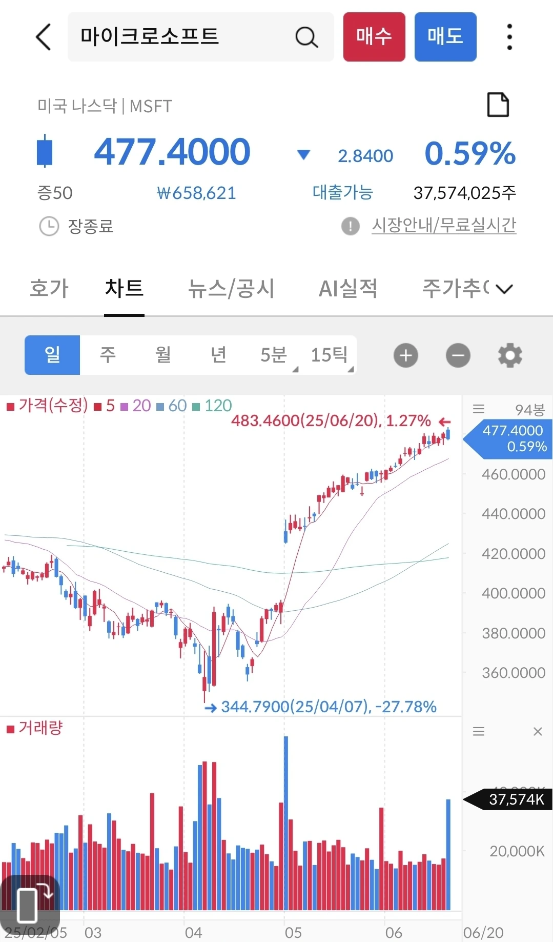 신고가를 계속 경신 중이다. 조만간 6월이 끝나고 2분기 실적 발표와 향후 가이던스가 나오면 마소가 어디까지 더 올라갈지 알 수 있을 듯 하다. 100주 매수를 목표로 하고 있는데, 이제는 달성하기 어려운 목표가 되었다. 가격이 많이 올랐다. 목표를 조정해 보자. 50주라도 먼저 분할매수로 꾸준히 모아 보자.