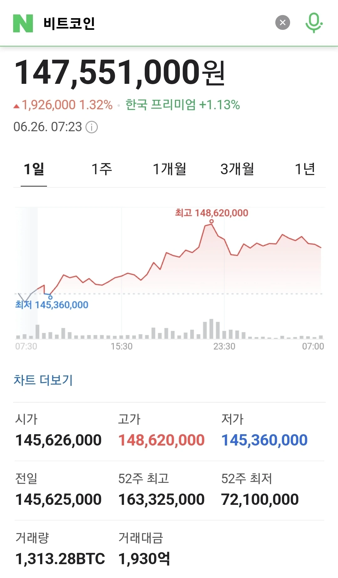1) 비트코인, 0.23% 오른 1억47백만원