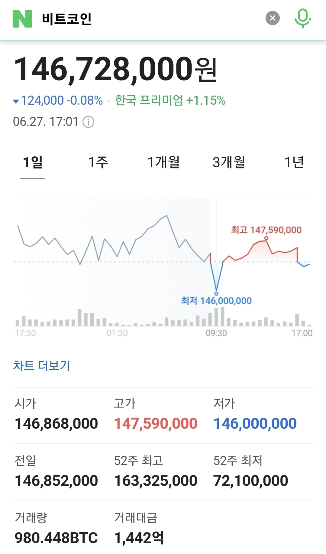 1) 비트코인, 0.31% 떨어진 1억47백만원