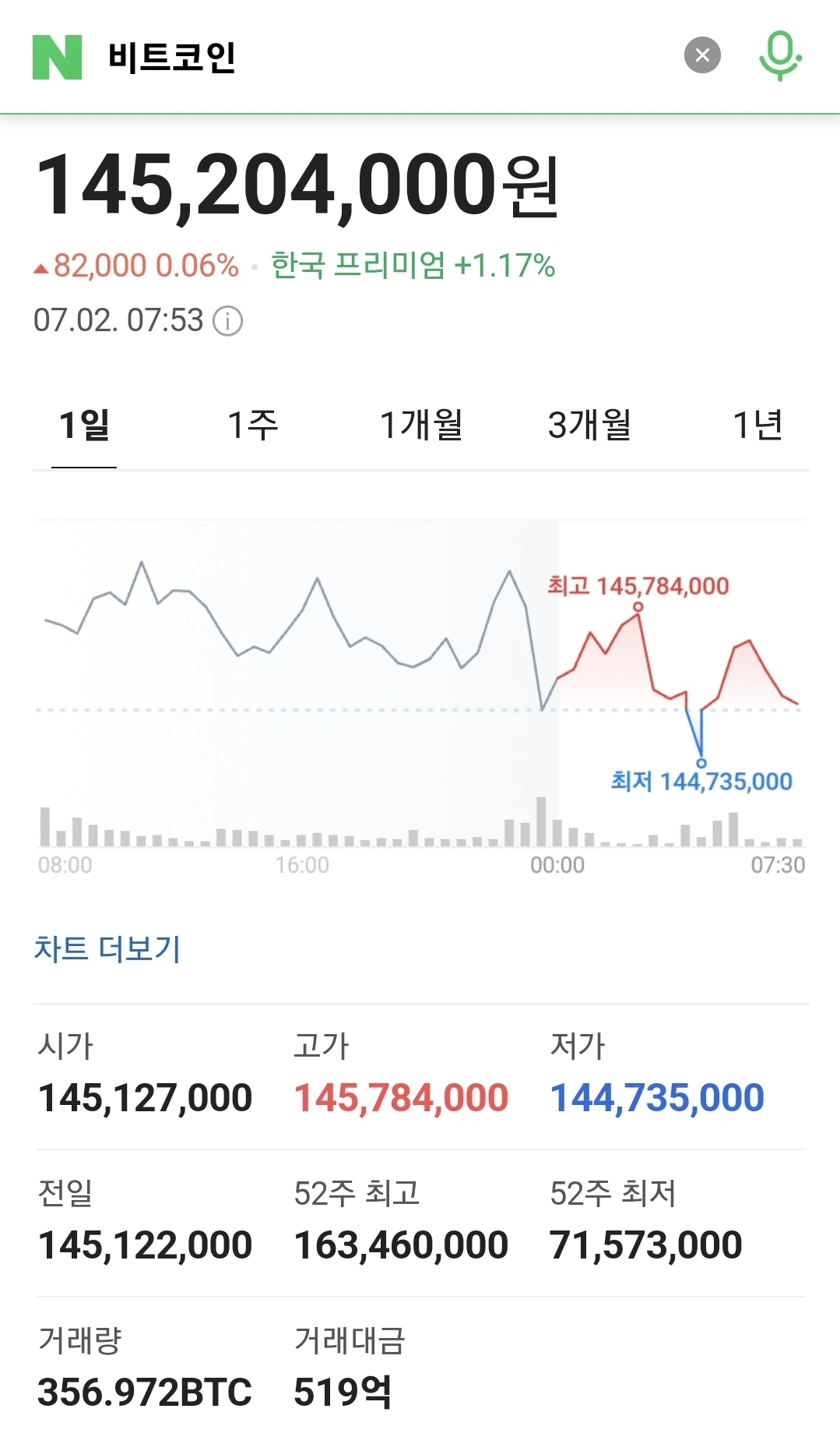 조정 장세, 1억4500만원대도 반납