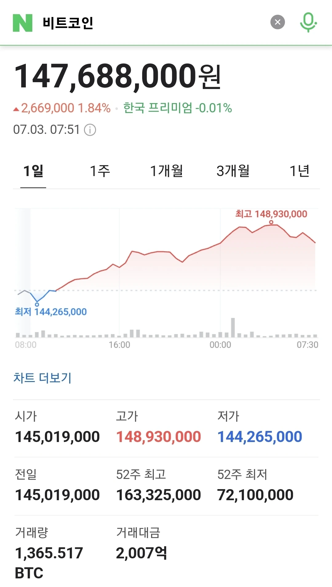 1) 비트코인, 0.19% 상승한 1억4765만원