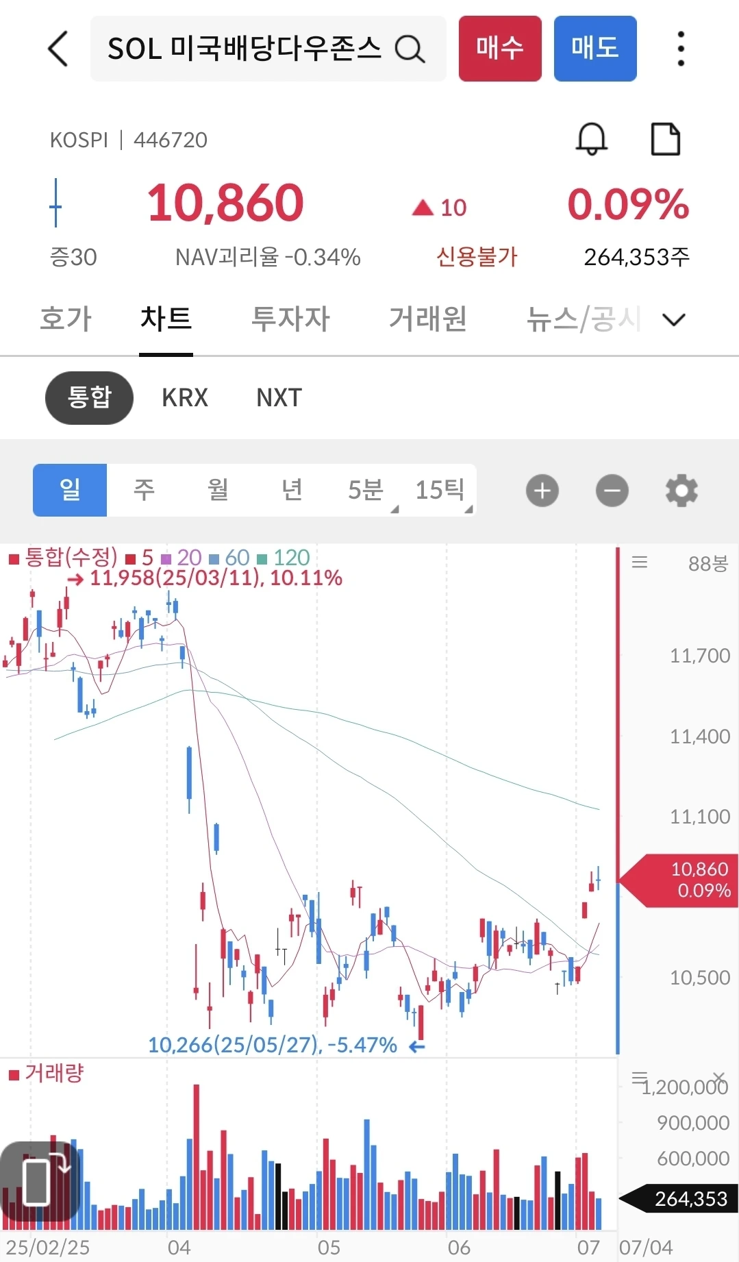 급락 후 횡보 중이다. 등락을 하나 아직은 상승 기미는 없다. 배당주라서 그럴 수 있다. 그래서 좀 더 지켜 보다가 정리하고 나스닥과 S&P로 넘어갈려고 고민 중이다. 굳이 배당금이 지금은 필요 없기 때문이다. 지금은 몸집을 키우는 것이 더 필요하다.