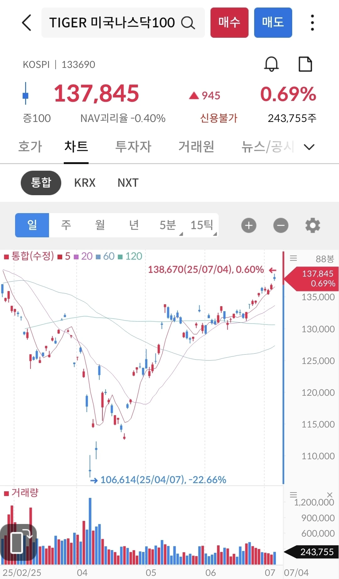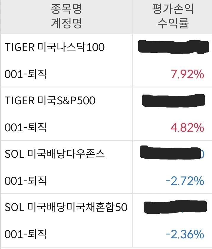 퇴직연금 계좌는 나스닥과 S&P500 상승에 힘입어서 플러스로 바뀌었다. 미국채도 올라줘서 다행인데 마음 속으로는 더 올라주면 고마울 듯 하다. 연금 개시 때까지는 아직 시간이 많이 남아 있으니 아마도 꾸준히 올라 줄 것이다. 지켜보자