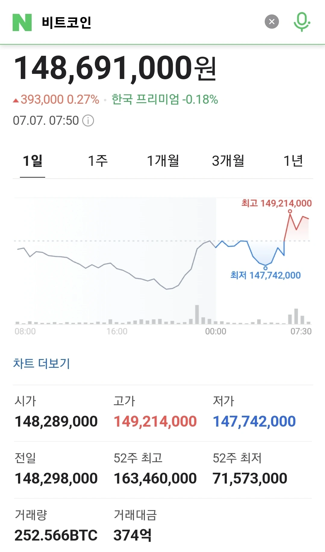 1) 비트코인, 0.14% 오른 1억 4853만원