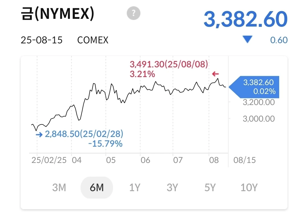 등락을 반복하고 있지만 완만한 우상향이다. 시중에 돈이 늘어나면 안전자산인 금으로 돈이 몰릴 것인데 아직은 급격하게 상승할 시기는 아닌가 보다. 금리인하가 되면 아마도 3500은 넘어가지 않을까 생각해 본다.