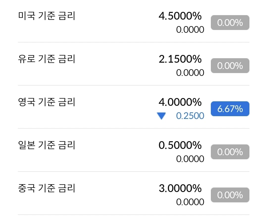 영국이 기준금리는 0.25% 내려서 4%이다. 한국의 기준금리가 2.5%로 유럽 다음으로 낮다. 일본은 마이너스 금리에서 이제 0.5%까지 올라온 것이다. 미국의 기준금리가 4.5%로 제일 높다. 경제활성화를 위해서는 기준금리를 인하할 것이다. 시장에서는 9월 금리인하를 유력하게 보고 있다.