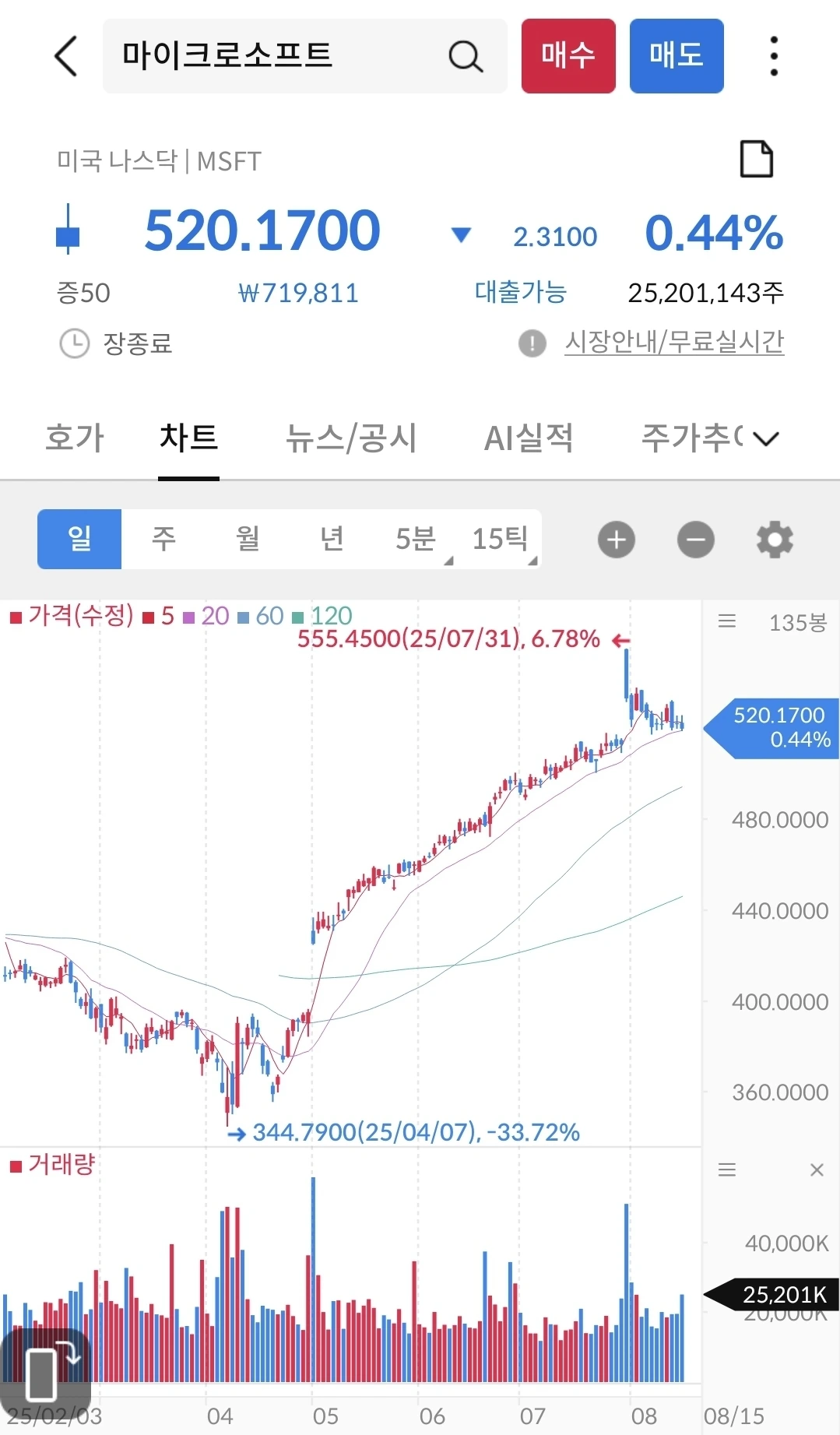 퇴근 후 아무생각없이 555불에서 1주를 매수 했다. 기분에 의해서 매수를 한 것이다. 555불만 보면 1주 매수한 것이 계속 생각난다. 마소는 지속 우상향 중이라서 후회는 없지만 기분에 따라서 매수 않도록 노력 중이다.
