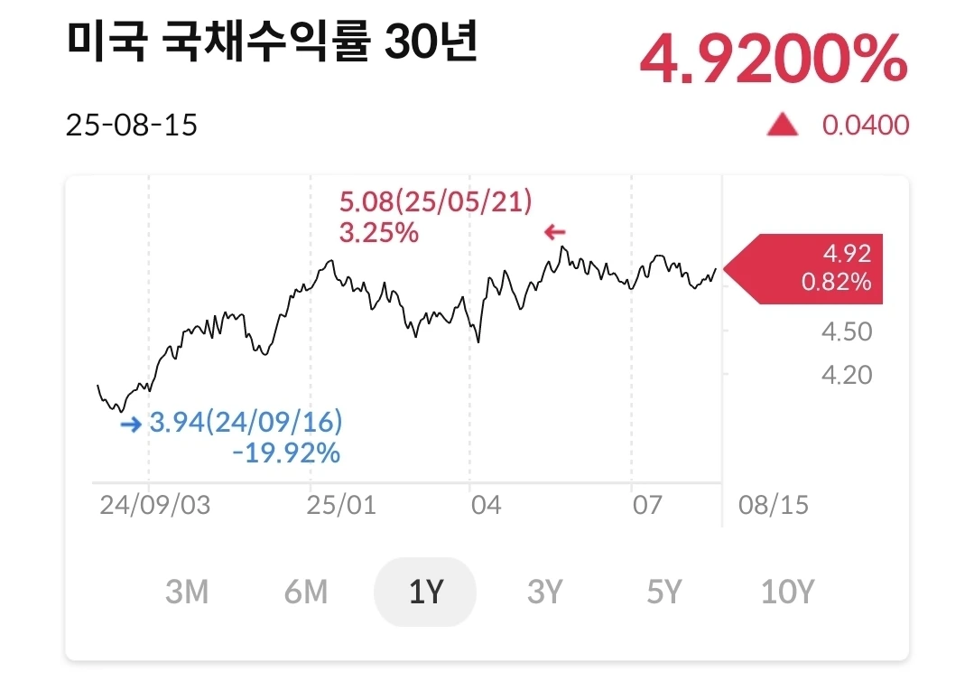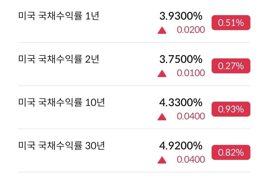 단기보다는 장기국채 수익률이 높다. 장기국채에 대한 수요가 줄어서 가격이 떨어진다는 말이다. 30년물은 수익률이 5%에 가깝다. 트럼프 정책의 부작용으로 국채수익률이 1년전보다 상당히 높다. 아마도 트럼프 행정부의 전과 후의 모습이다. 미재무부 장관도 단기국채 중심으로 발행하고 장기국채는 내년으로 넘긴다는 말이 있다. 정부가 이자를 감당하기 어렵다는 의미다.