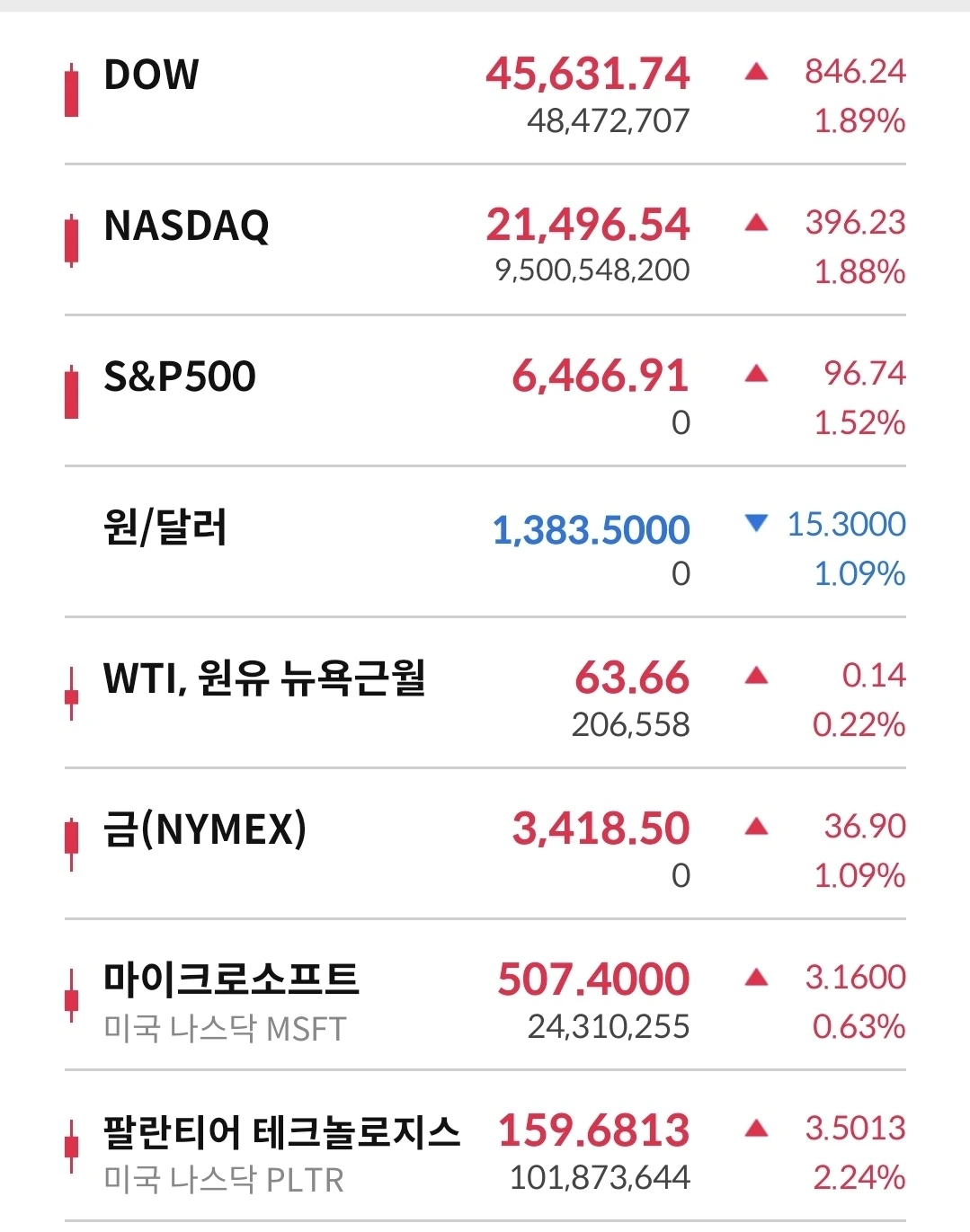 모든 상품들이 상승으로 전환