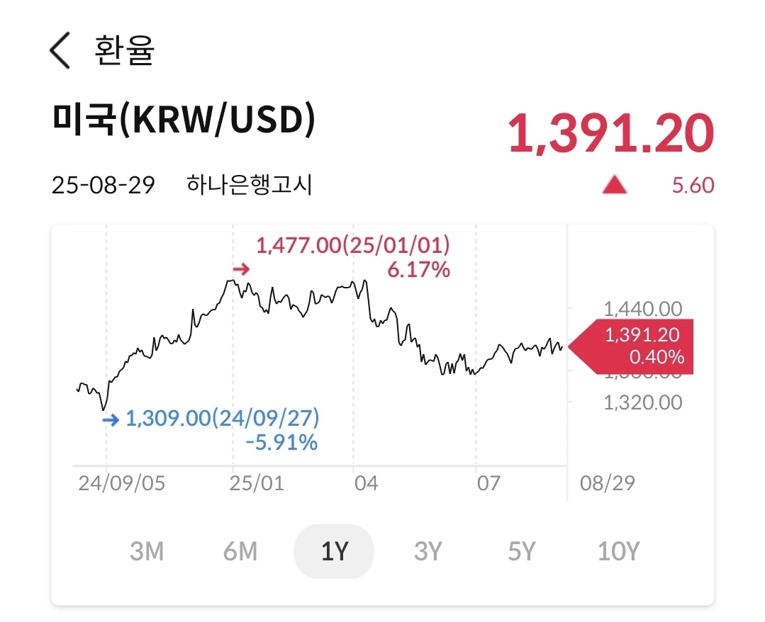 1380과 1390원 사이에 고정되어 움직인다. 금통위에서 금리동결을 발표하면서 큰 변화가 없었다. 미국 금리인하가 발표되면 어떻게 움직일지 관찰이 필요하다. 지켜보자.