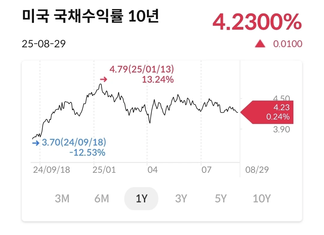 상승 후 하락 중이다. 그래프를 봐도 하락세가 뚜렷하다. 얼마나 더 떨어질지는 모르겠으나 금리인하가 결정되고 횟수가 나오면 다시 상승세로 전환되지 않을까?