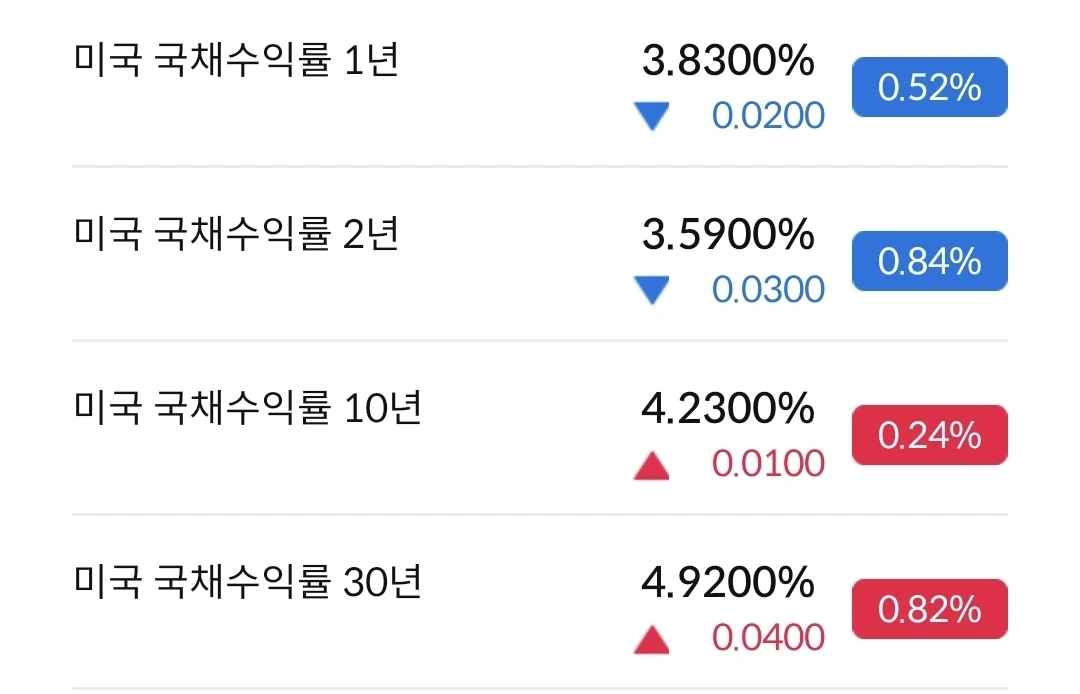 2년물은 하락세가 뚜렷하고, 10년물은 약간 하락세처럼 보이고, 30년물은 상승세로 보인다. 미국정부에서 국채발행을 운영하는 방향이다. 단기채에 집중해서 운영 중이다.