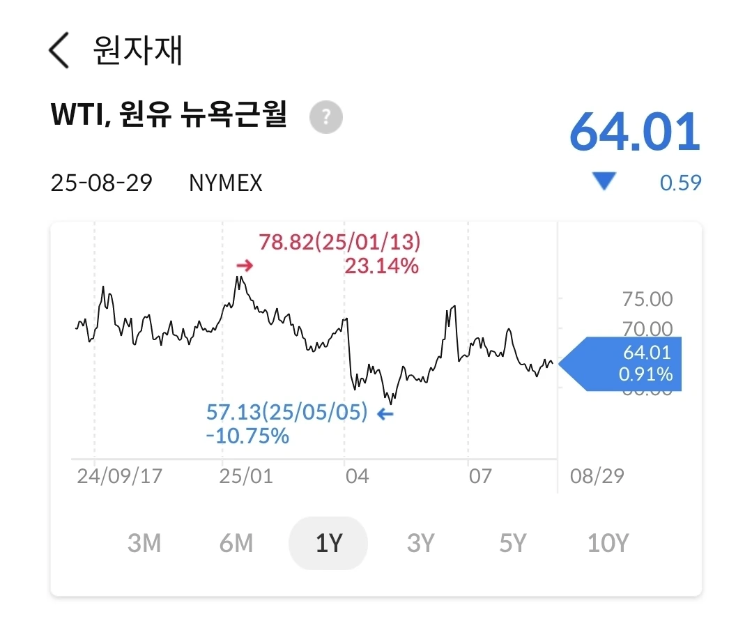 유가는 60불대에 오랫동안 머물고 있다. 시장에서 공급과 수요가 적절히 근형을 맞추면서 움직이는 느낌이다. 현재의 유가는 인플레를 자극하지 않으면서 꾸준히 유지될 것으로 보인다.