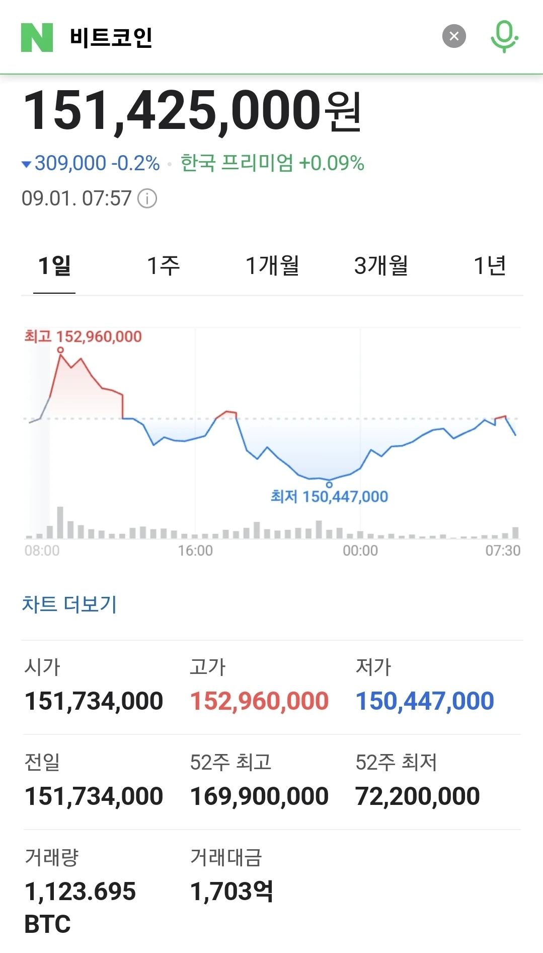 1) 비트코인, 0.59% 떨어진 1억4990만원