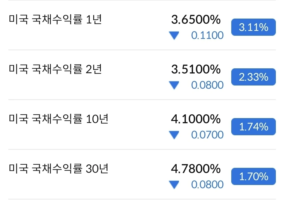 2년물과 10년물은 하락 추세를 보이고, 30년물은 여전히 수익률이 높다. 시장에서 30년물에 대한 수요가 없는 것인지 아니면 미국재무부에서 이자부담으로 30년물을 덜 발행하는지 둘 중에 하나 일 것이다.