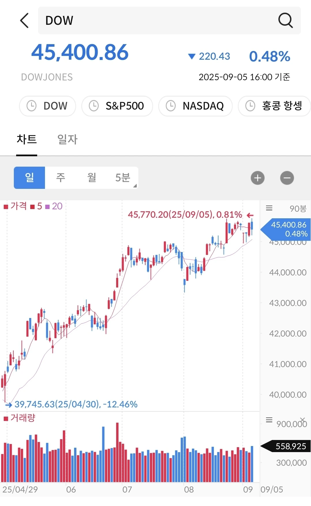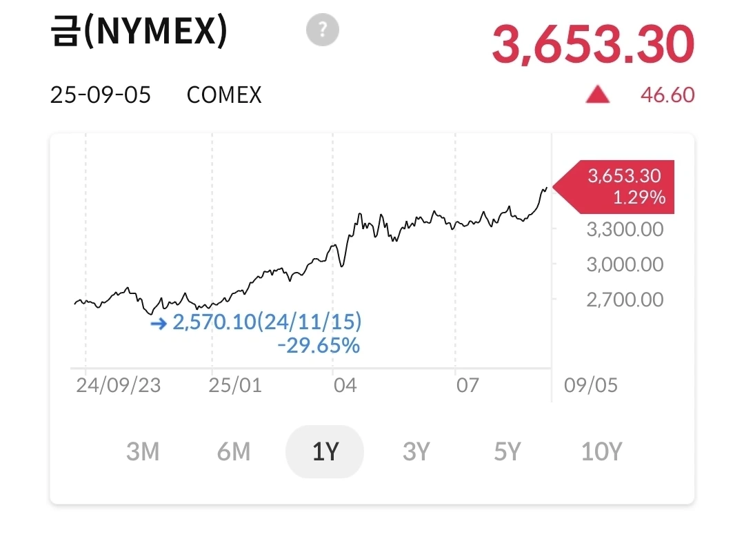 다시 상승세로 전환되었다. 이제는 3600대를 넘어서 상승 중이다. 연말까지 3900이 된다고 하니 지금은 투자해 볼만 하다. 안전자산에 투자하고 싶으면 금을 보유하면 좋을 시기이다.