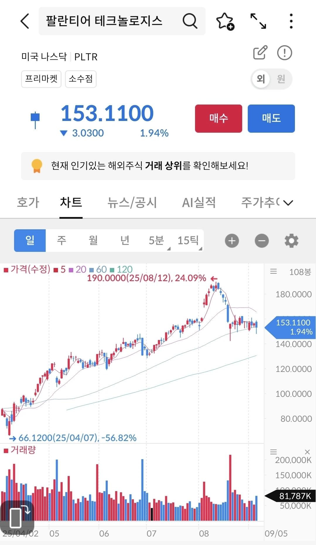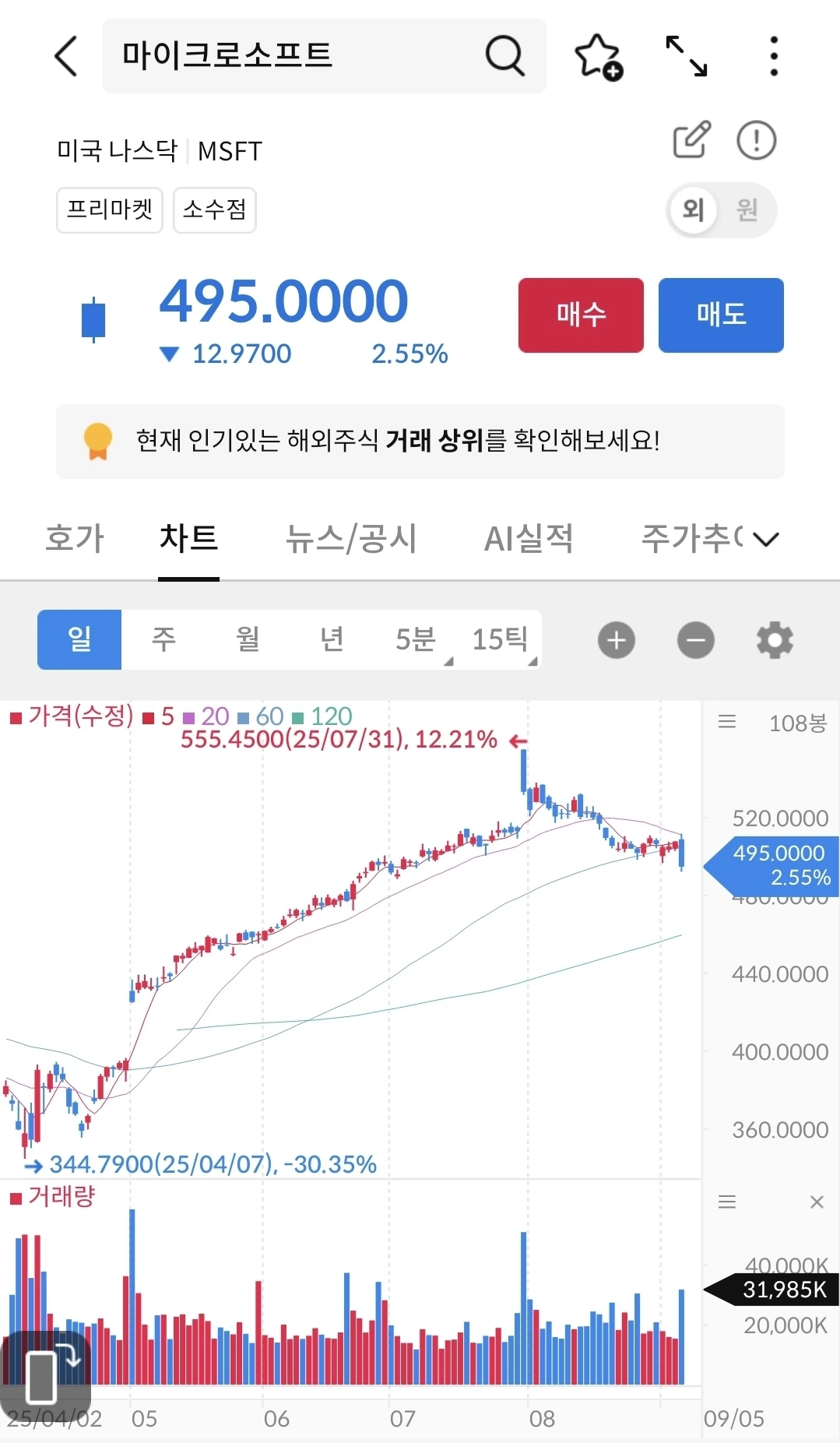 우상향하다가 지금은 크게 떨어져서 등락 중이다. 금리인하가 되면 어떻게 될지 지켜보자. 아직까지는 엔비디아와 비슷한 패턴으로 움직이고 있다.