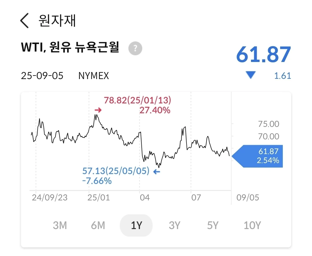 등락을 반복 중이나 수요대비 공급이 늘면서 60불대 초반까지 하락했다. 지금 상황이라면 50불대까지 떨어질 수도 있다. 지켜보자.